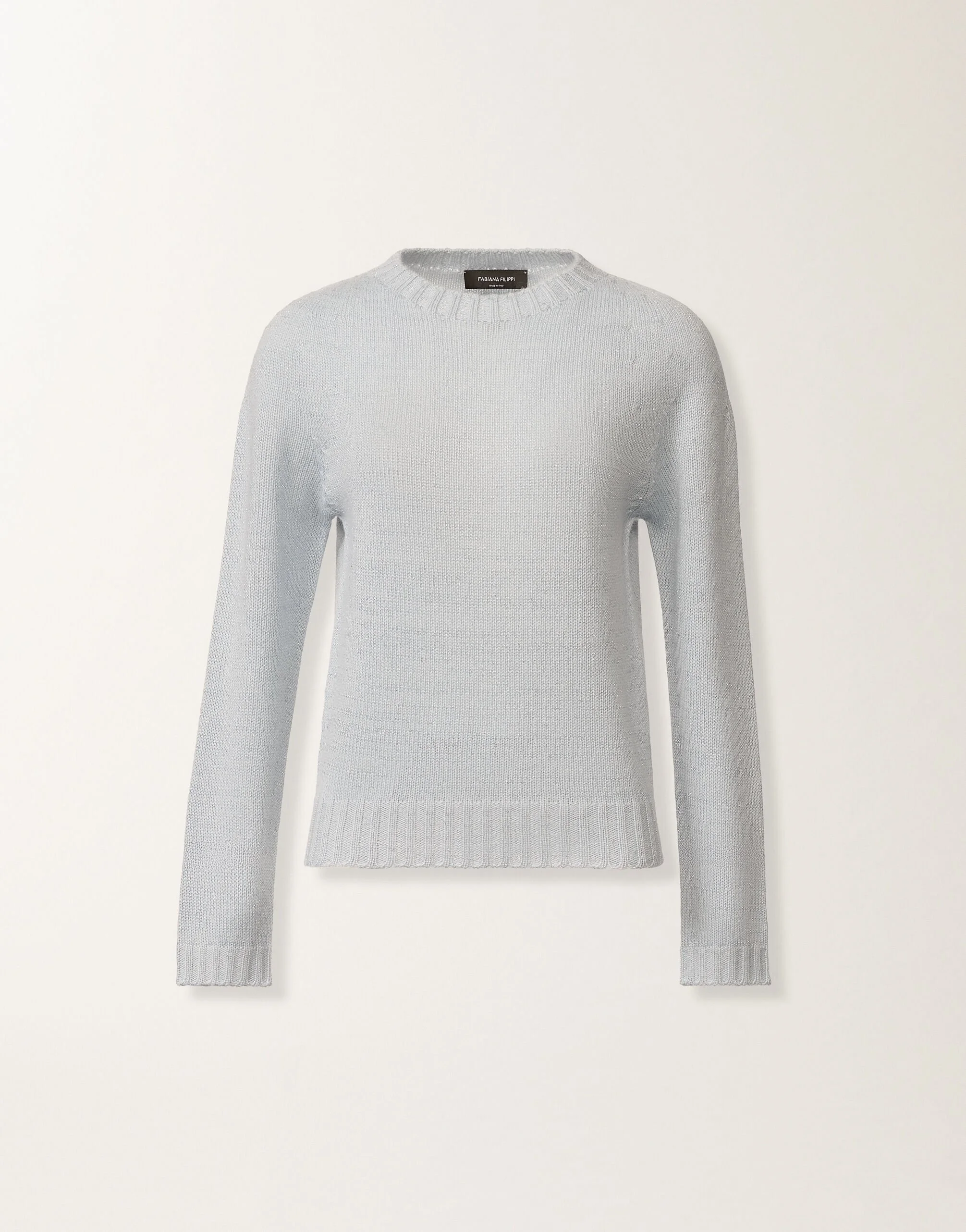 Crew neck sweater in Platinum, the exclusive Fabiana Filippi yarn that combines wool, cashmere, and silk into a luxurious and refined texture. The luminous vanise mesh knit with lurex thread elevates the minimalist design with a sophisticated touch. Entirely made in Italy using sustainable processes. The model is 1,79 m tall and wears size IT 40. Details Platinum Yarn with Lurex Crew Neck Fabric: 66% wool – 13% silk – 9% viscose – 9% cashmere – 3% polyester Length: 55 cm (size S) Made in Italy Model MAD266F031L89700005154