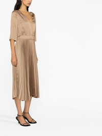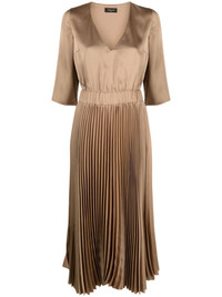 pleated midi dress Fabiana Filippi's designs merge traditional craftsmanship and timeless design, as evidenced by this midi dress from the AW23 collection. It's cut from neutral satin with a simple V-neck top that falls to a pleated skirt with an elasticated waistband. Highlights - Brown - Satin finish - V-neck - Half-length sleeves - Elasticated waistband - Pleated skirt - Below-knee length Made in Italy Composition Polyester 100% Washing instructions Dry Clean Only