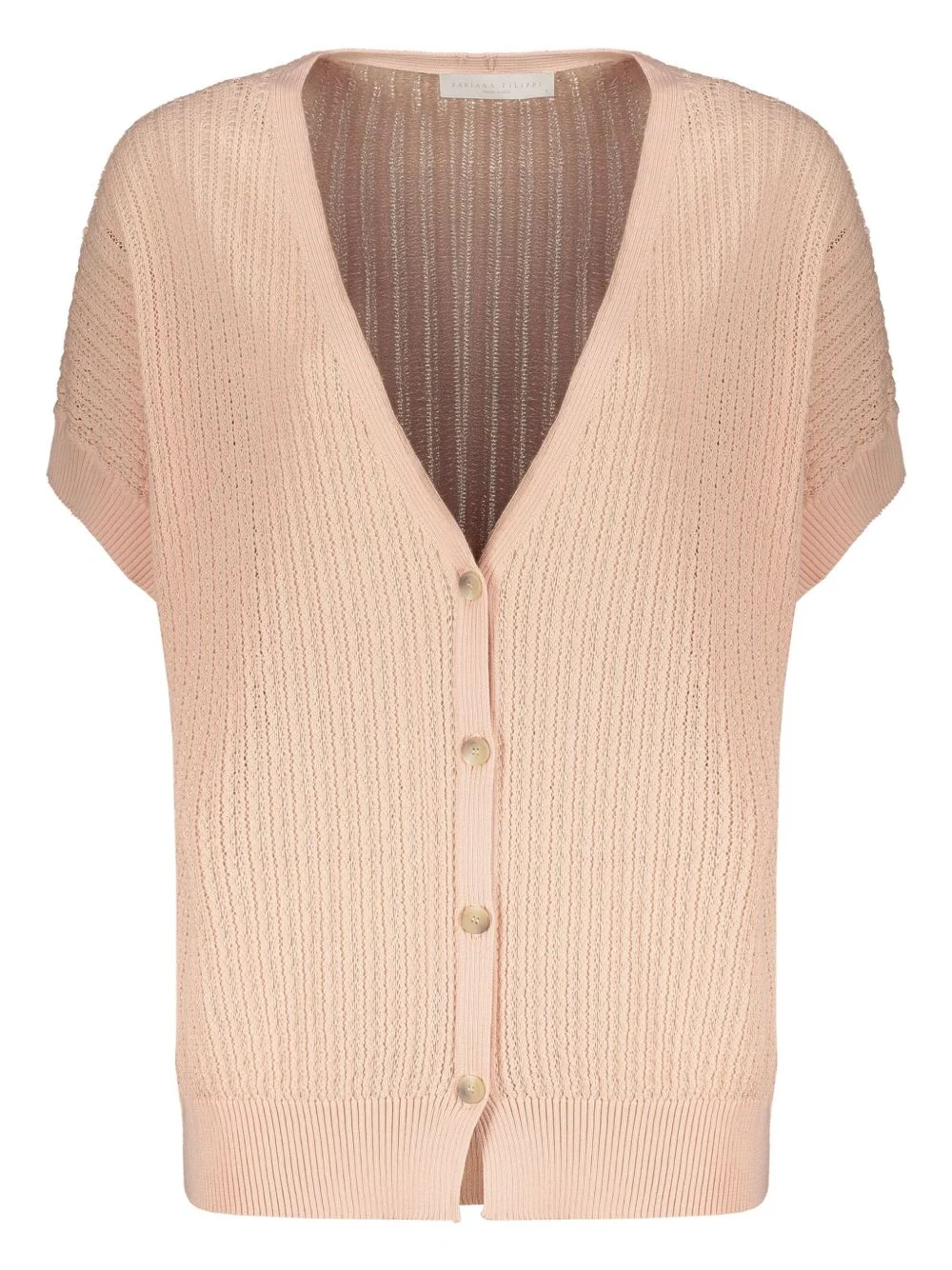 pointelle-knit cardigan Highlights - Light pink - Front button fastening - V-neck - Drop shoulder - Short sleeves Made in Italy Composition Cotton 100% Washing instructions Machine Wash