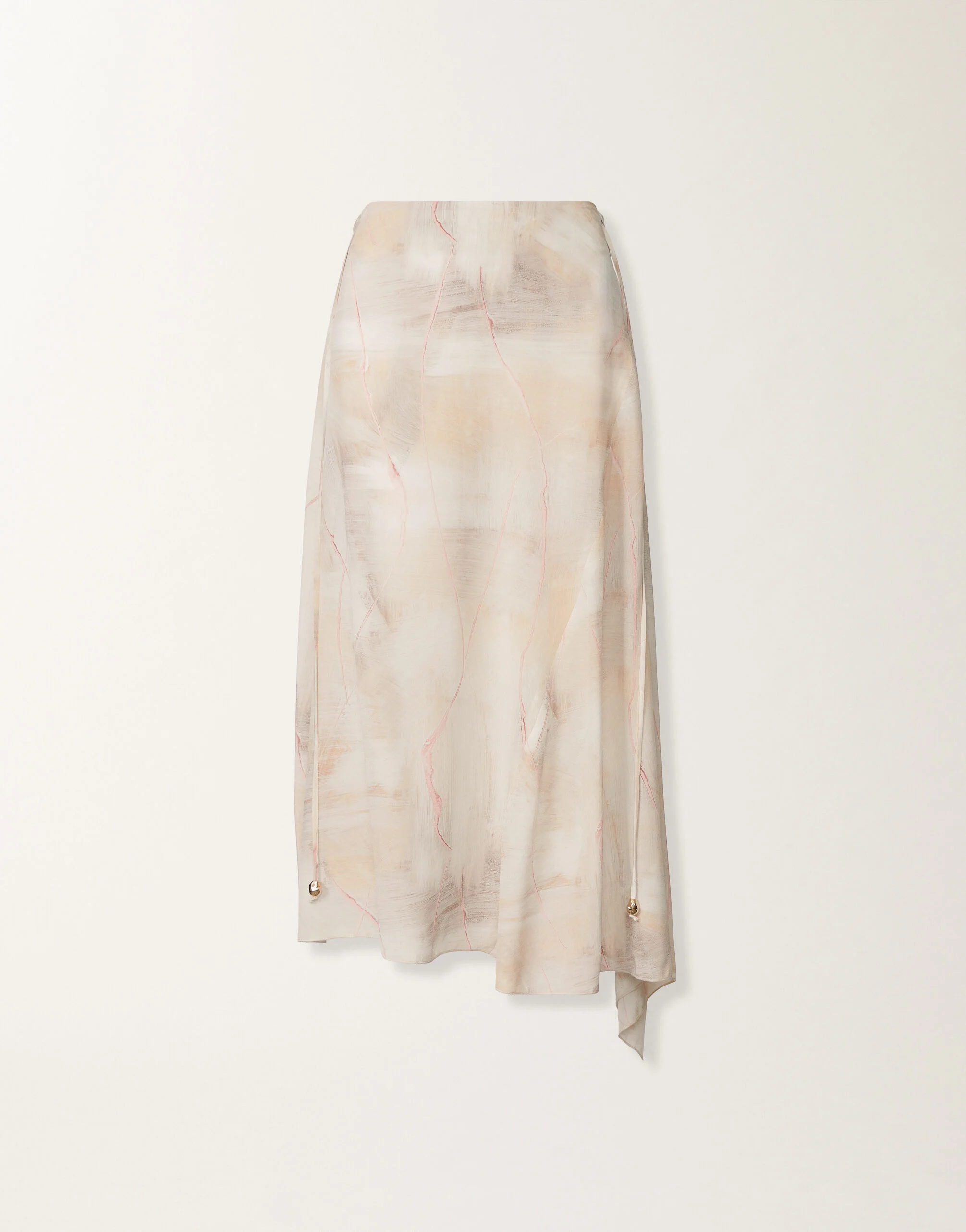 This skirt, featuring a godet insert and a drawstring at the back, is crafted from elegant printed crepe de chine, enhanced by a refined bow detail at the back. The Fusione Materica print, inspired by the art of Alberto Burri, reproduces a series of brushstrokes on a light-coloured base, creating a textured effect enriched by delicate touches of pink. Nugget detail. Produced entirely in Italy through sustainable processes. The model is 1,78m tall and is wearing size IT 40 Details Crepe de chine Pleat and bow on the back Textured Fusion Printing Nugget detail Fabric: 100% silk Made in Italy Model GND215F421D8860000VR1