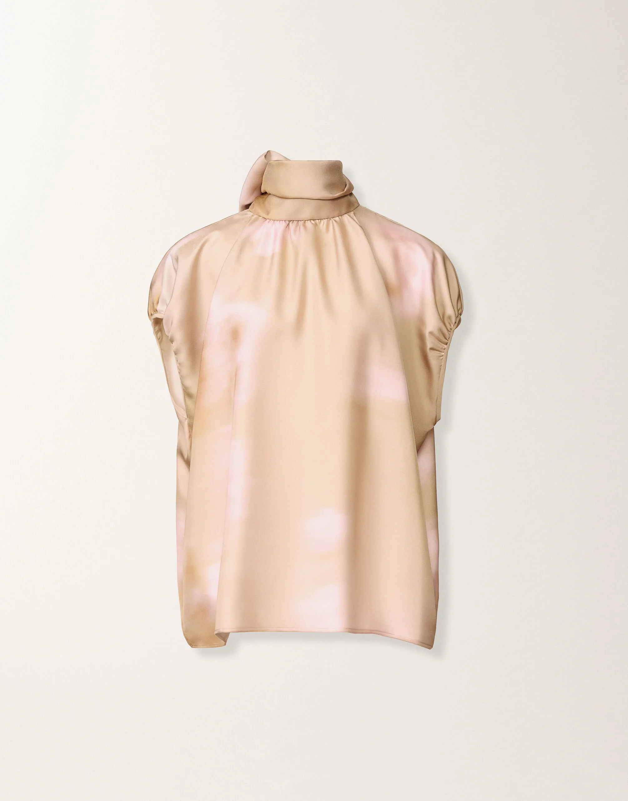 Printed silk twill top featuring a bow collar. The abstract floral-inspired print, with its soft contours and evocative colors, imbues the piece with artistic and dynamic charm. Finished with pink piping, it is crafted in Italy using sustainable processes and high-precision digital printing techniques. Details Printed silk twill Bow collar Pink piping Fabric: 100% silk Made in Italy Model TPD276F748D9720000VR1