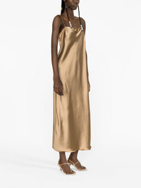 satin slip midi dress Fabiana Filippi's AW23 collection is an 'irresistible fusion of lightness and dynamism', as seen with this flowy satin midi dress. Rendered in an earthy hue, it falls to a sleek slip silhouette, secured by delicate spaghetti straps. Highlights - Earth brown - Satin finish - Square neck - Spaghetti straps - Slip silhouette - Mid-length - Straight hem Made in Italy Composition Viscose 100% Washing instructions Dry Clean Only