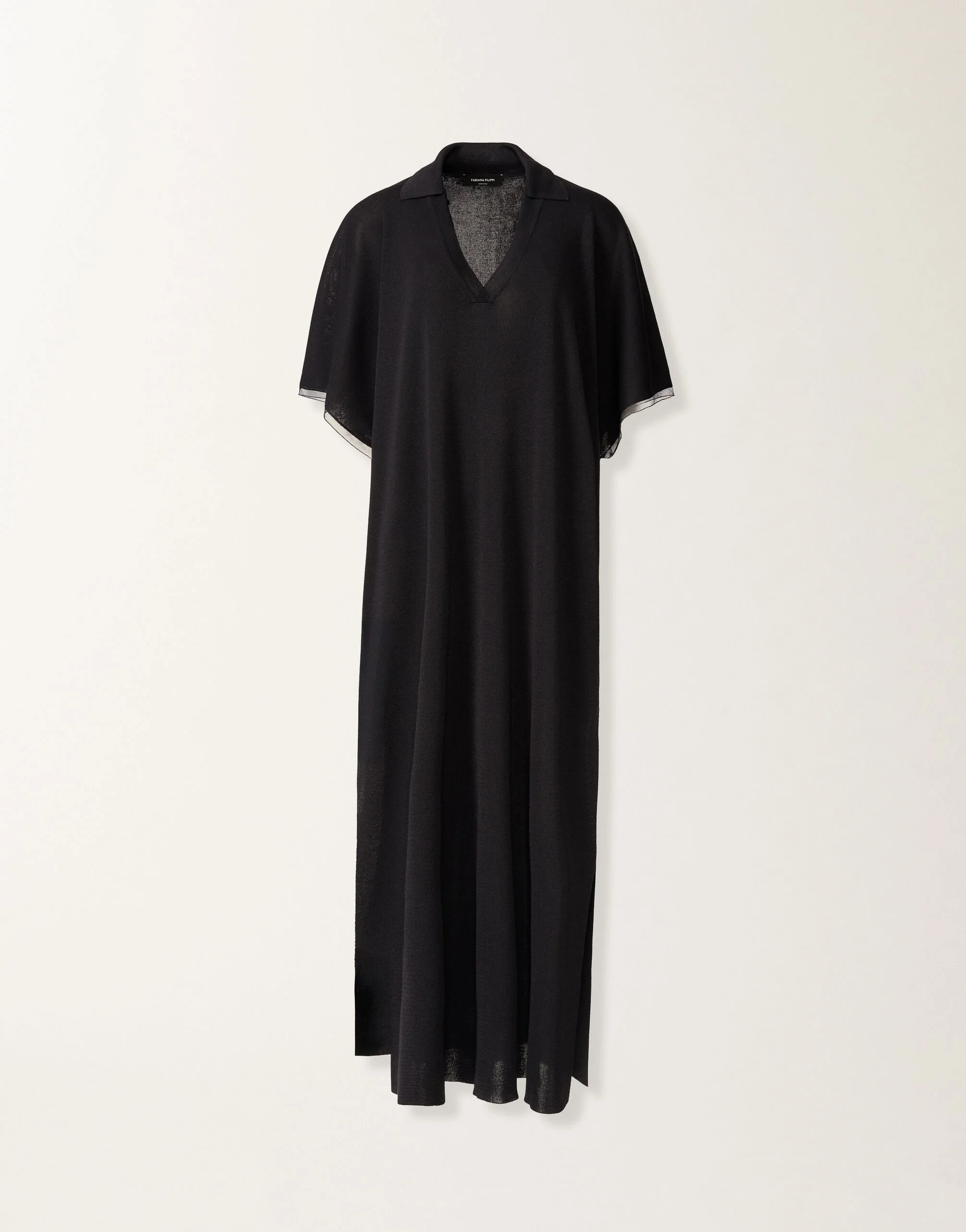 Caftan dress in lightweight viscose, crafted with a new yarn that offers a silky feel and a lustrous finish, embodying feminine and refined elegance. The tight-knit design gives a contemporary twist to the classic caftan, while the floating diamond thread on the cuffs adds a subtle and sophisticated touch of sparkle. Made in Italy through sustainable processes. The model is 1.74 m tall and wears size IT 40 Details Light viscose Tight knit Diamond yarn Fabric: 78% viscose – 22% polyester Tulle: 100% polyamide Made in Italy Model ABD276F604M10900005146