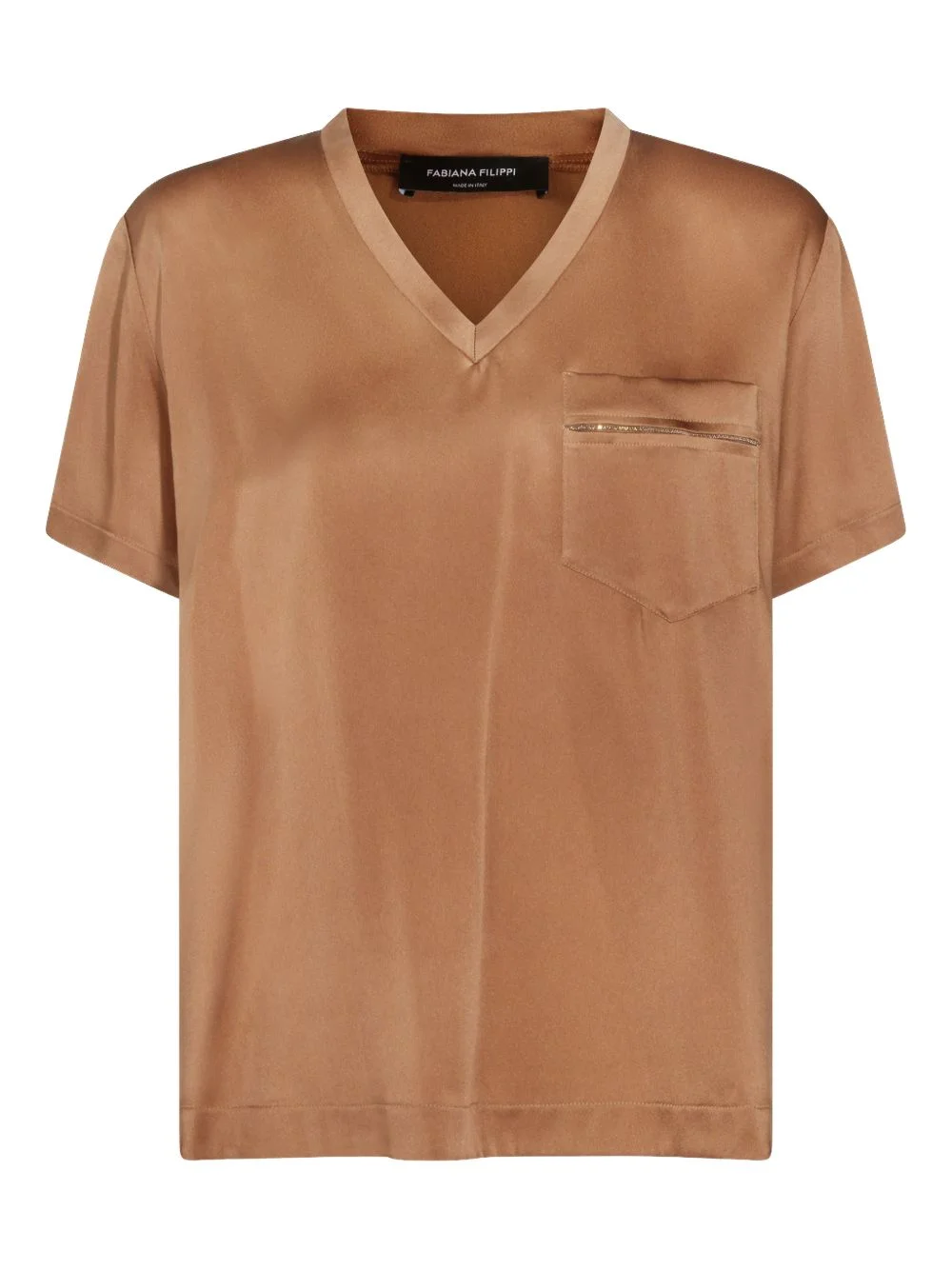pocket V-neck T-shirt Highlights - Cognac brown - Chest pocket - V-neck - Short sleeves Made in Italy Composition Viscose 54%, Acetate 46% Washing instructions Read Manufacturer Guidelines