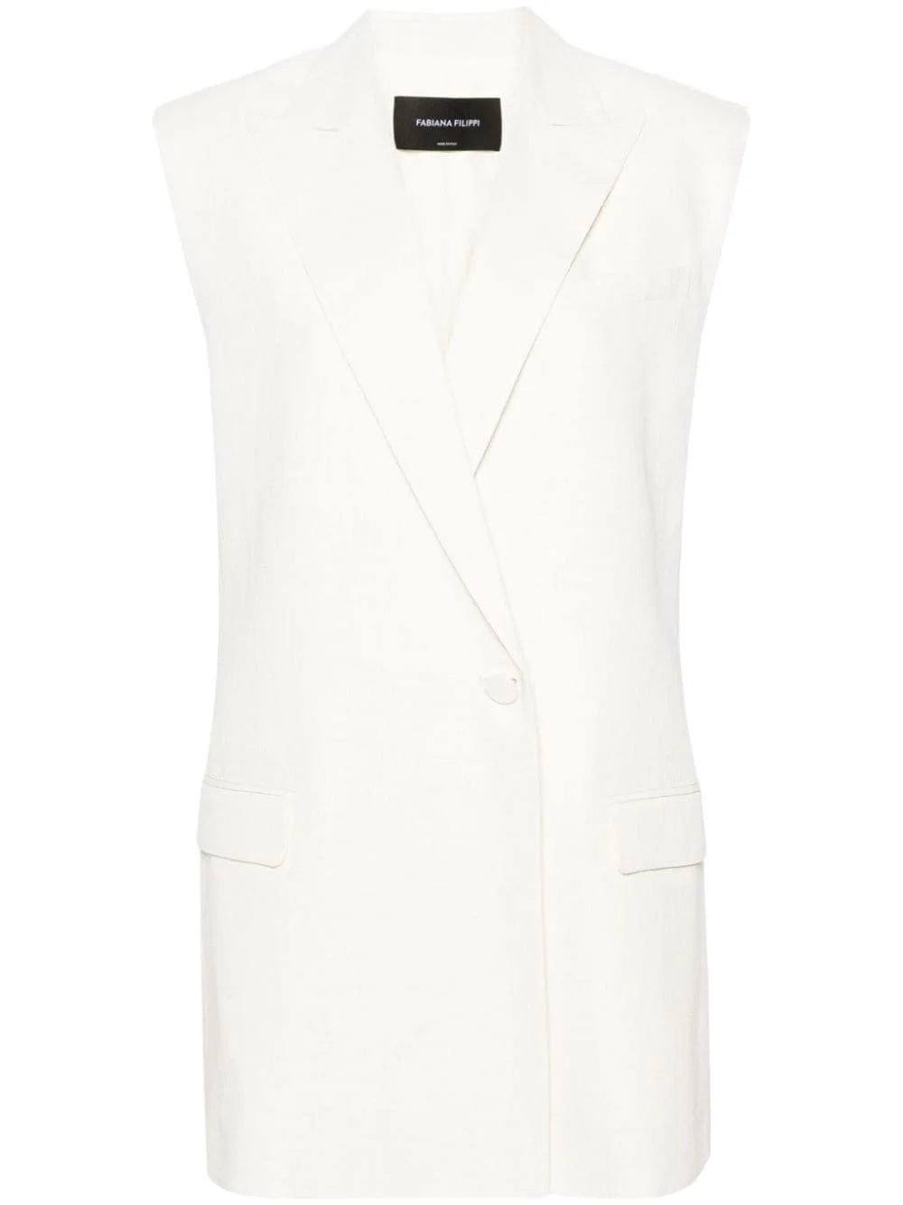 single-breasted linen-blend gilet Highlights - Off-white - Linen blend - Peak lapels - Front button fastening - Sleeveless - Chest welt pocket - Two front flap pockets - American rear vent - Straight hem - Satin lining Made in Italy Composition Outer: Linen/Flax 60%, Viscose 26%, Polyester 14% Lining: Viscose 100% Washing instructions Dry Clean Only