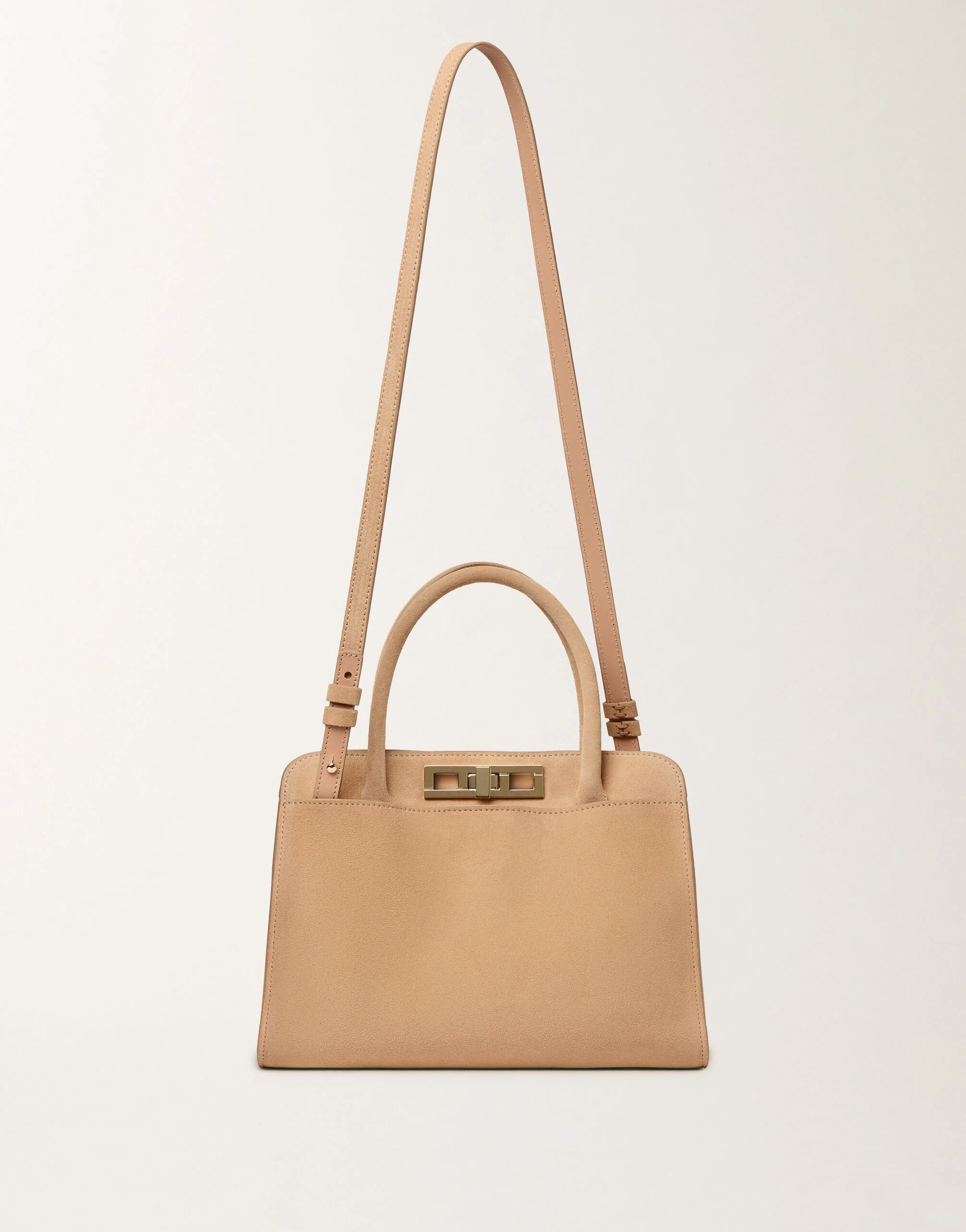 Medium handbag with an essential design, crafted from soft suede with a silky and velvety touch. The metal twist-lock closure adds a touch of elegance, while the attention to detail ensures both functionality and style. Complete with a detachable shoulder strap for hand or shoulder carry, it is entirely made in Italy using sustainable processes. Details Metal accessory 100% suede Lining: 85% polyester – 10% cotton – 5% polyurethane Made in Italy Model BGD266A852M00000000158