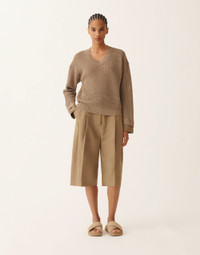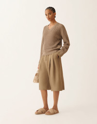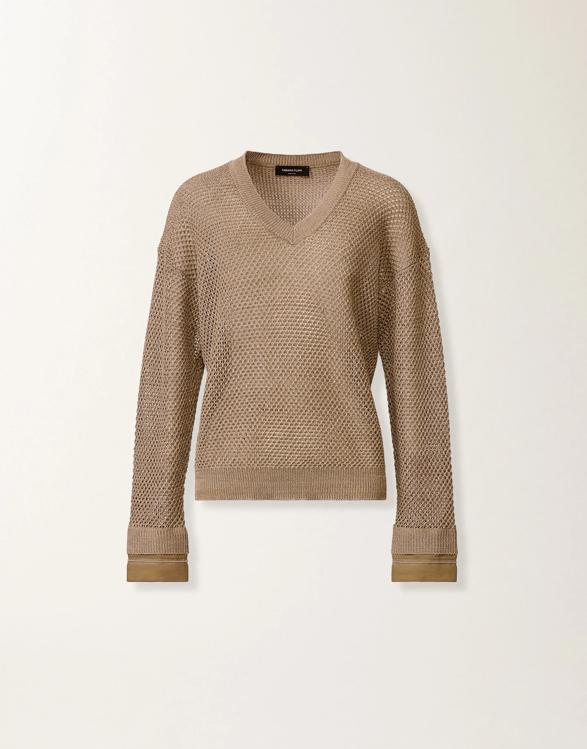 V-neck sweater crafted from perforated organic cotton and lightweight viscose, accented by cuffs in a fluid blend of linen and viscose and featuring an elegant diamond-thread entre-deux detail. A harmonious balance of lightness and radiance, made in Italy through sustainable processes. The model is 1.74 m tall and wears size IT 40 Details Organic cotton with viscose Filo Diamante entre-deux Fabric: 49% cotton – 40% viscose – 11% polyester Cuffs: 64% viscose – 36% linen Tulle: 100% polyamide Made in Italy Model MAD276F481M1560000VR3