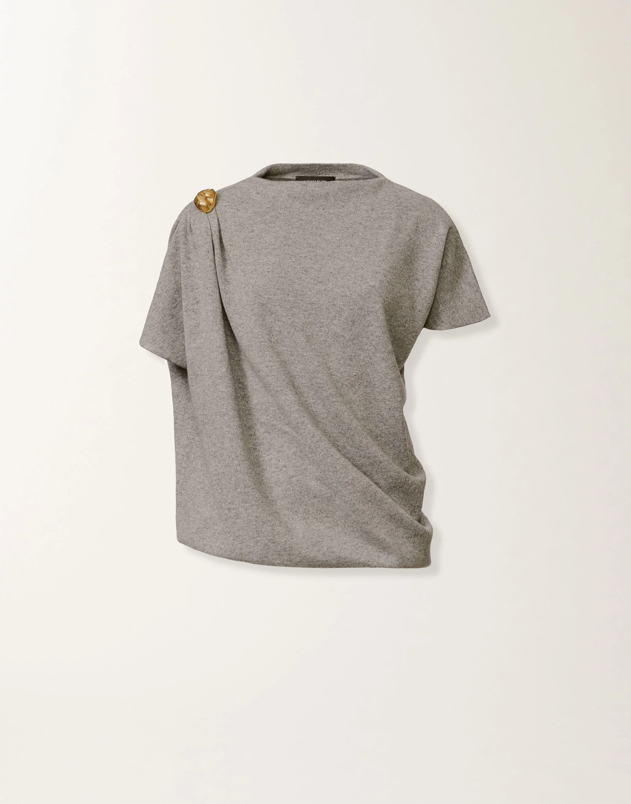 A sense of modern, effortless elegance defines this kimono-sleeve sweater made from Platinum, Fabiana Filippi’s exclusive yarn blending wool, cashmere, and silk. The luminous pepita accent emphasizes the draped shoulder. Entirely made in Italy with a sustainable focus. The model is 1.79 meters tall and wears size IT 40. Details Platinum yarn Kimono sleeve Draping Pepita detail Fabric: 75% wool – 15% silk – 10% cashmere Length: 73 cm (size 40) Made in Italy Model MAD225F482N12800008132