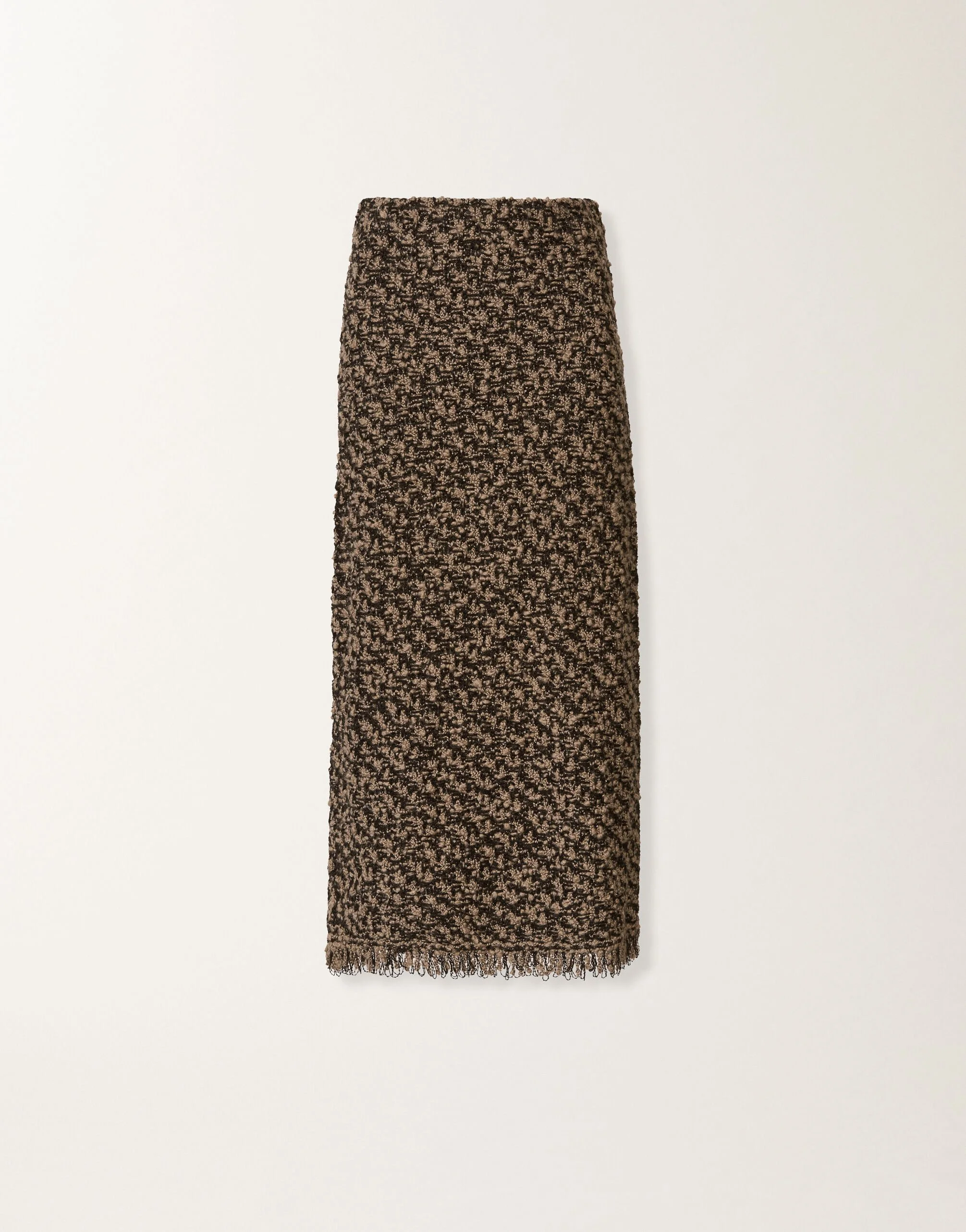 The Autumn-Winter 2025–26 collection explores unique materials. This below-the-knee wool tweed skirt is enriched with luminous contrast sequins for a feminine and structured image. Entirely made in Italy with sustainable processes. The model is 1.76 meters tall and wears size IT 40. Details Bicolor tweed with sequins Fabric: 38% wool – 37% acrylic – 19% polyamide – 3% virgin wool – 1% silk – 1% cashmere – 1% polyester Internal waistband: 75% virgin wool – 15% silk – 10% cashmere Made in Italy Model GND225F809L6290000VR2