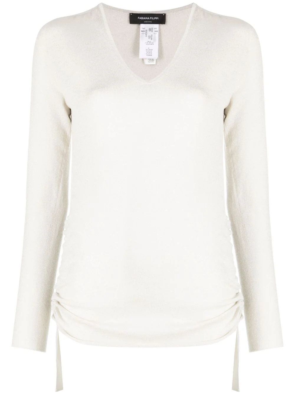 v-neck knitted jumper Highlights - Light beige - Virgin wool blend - Knitted construction - V-neck - Long sleeves - Ruched detailing Made in Italy Composition Outer: Virgin Wool 84%, Polyamide 9%, Polyester 7% Lining: Polyester 100% Washing instructions Hand Wash