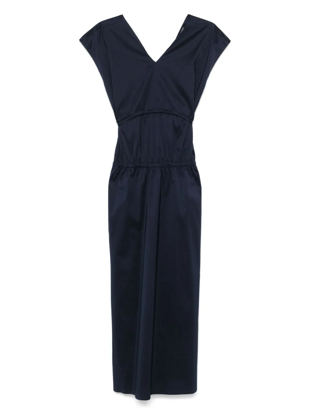 V-neck midi dress Highlights - Navy blue - Short sleeves - Drawstring waist - Two side inset pockets - Straight hem Made in Italy Composition Cotton 63%, Polyester 37% Washing instructions Machine Wash
