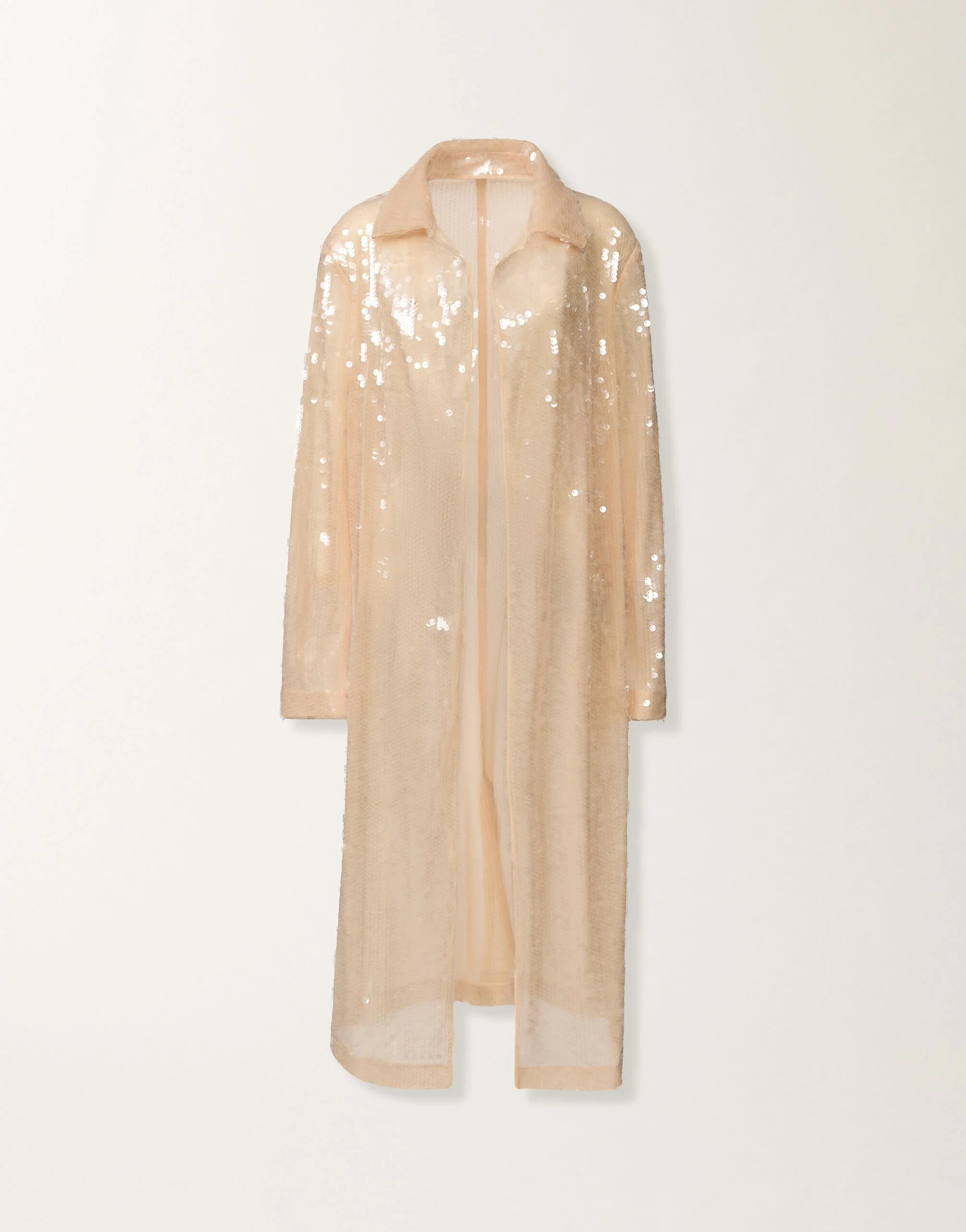 Long coat with a jacket-style collar, crafted from an exclusive fabric featuring transparent sequins embroidered on stretch tulle. The overlapping sequins create reflections reminiscent of the play of light on water, while the stretch base ensures comfort. Entirely made in Italy using sustainable processes. The model is 1,77 m tall and wears size IT 40. Details Water effect sequins Jacket collar Fabric: 100% polyester Length: 117 cm (size 40) Made in Italy Model CTD266F255L7930000VR1
