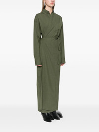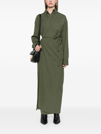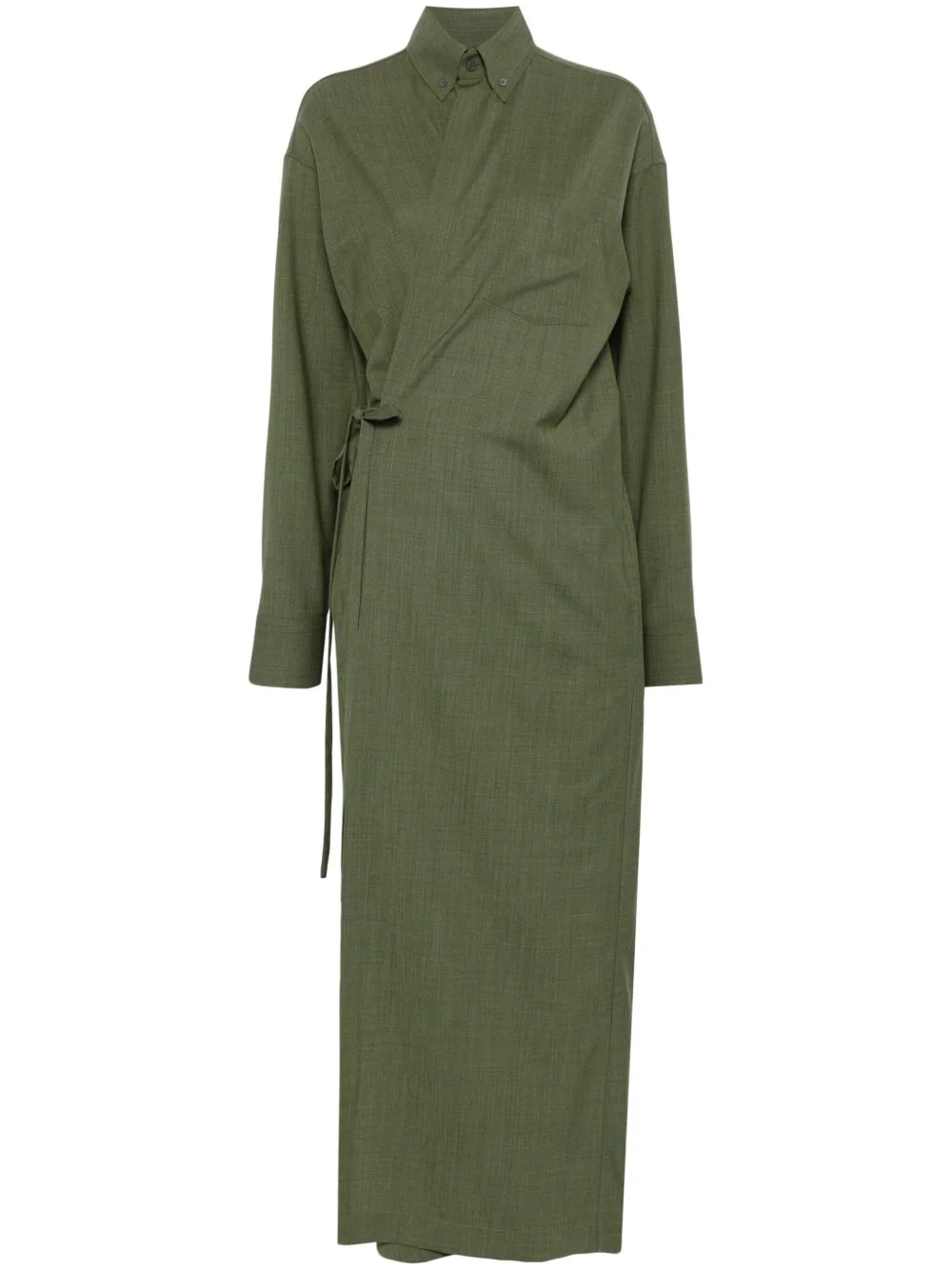 wrap maxi dress Highlights - Olive green - Merino wool blend - Interlock weave - Wrap design - Classic collar - Long sleeves - Buttoned cuffs - Chest patch pocket - Tied waist - Box-pleat detail - Unlined - Straight hem - Long length Made in Italy Composition Merino 75%, Polyamide 23%, Elastane 2% Washing instructions Machine Wash