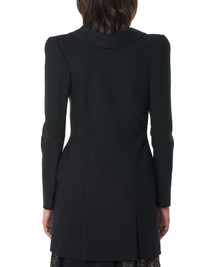 Faith Connexion reverse-facing tailored jacket in black, puffed shoulder pads, peaked lapels, double-breasted rear closure with ornamental buttons, darted back, princess-seamed front, double vent at front hem, set-in sleeves, straight hem, tonal stitching. Made in Slovakia. Composition - 52% Polyester, 43% Wool, 5% Elastane; 100% Polyester (Collar Lapel); 100% Viscose (Body Lining); 100% Cupro (Sleeve Lining) Model is 5ft 10” and wearing a size S. Bust: 32” Waist: 26” Hip: 31.5”