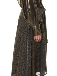 Faith Connexion Lurex-weave asymmetrical skirt in gold/silver/multi, offset waistband snap closures, layered fold-down waist, semi-attached lining, curved hem, tonal stitching. Made in Hungary. Composition - 55% Metallized Polyester, 45% Polyester; 75% Acetate, 25% Polyester (Lining) Model is 5ft 10” and wearing a size S. Bust: 32” Waist: 26” Hip: 31.5”
