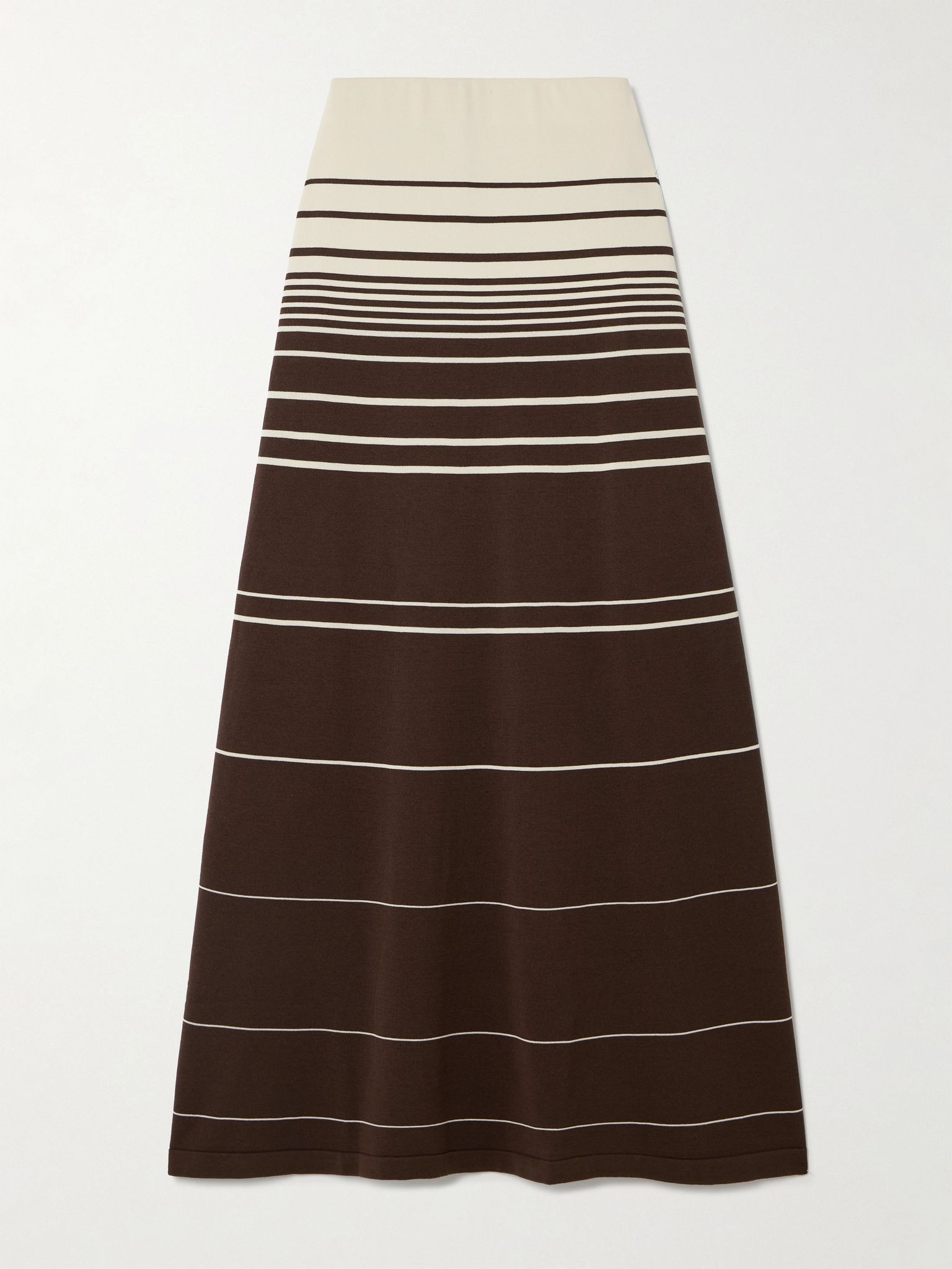Faithfull's 'Casia' maxi skirt is striped with lines of varying widths in beige and brown. It's knitted from cotton-blend and flares out to an A-line profile. Wear yours with the matching polo shirt for the most striking take. Size & Fit - Fits true to size, take your normal size - Maxi-length, designed to be worn at the waist - Fine knit - Model is 177cm/ 5'10" and is wearing a size XSmall Model measurements: - Bust: 81cm/ 32" - Waist: 68cm/ 27" - Hip: 94cm/ 37" Details & Care - Brown and beige cotton-blend - Slips on - 61% cotton, 38% nylon, 1% elastane - Hand wash - Designer color: Accordion Stripe