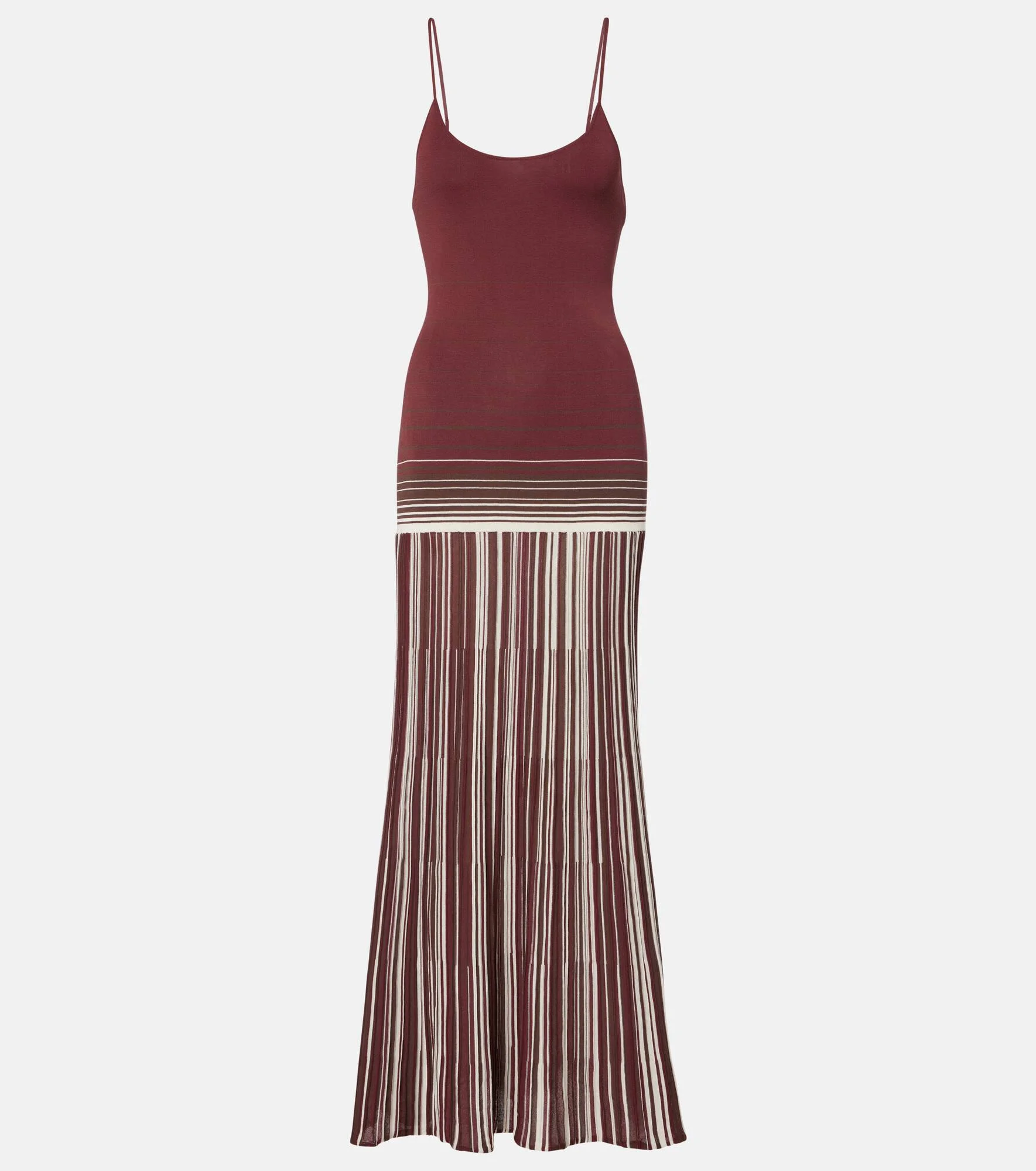 True to Faithfull's ethos, this design brings the brand's passion for travel and summertime into focus. Crafted from a stretch cotton blend, the Cecile maxi dress features a low-back design with a fitted bodice and flowing skirt. Product Details - Material: 62% cotton, 37% nylon, 1% elastane - Care instructions: hand wash - Made in China - Designer color name: Accordion Stripe Bordeaux - Item color: burgundy, brown, white - Adjustable shoulder straps - Item number: P01093371 Size & Fit - True to size - Low back - Fitted - Stretchy fabric - The model seen in the picture is 178cm-5'10" and wearing a size XS