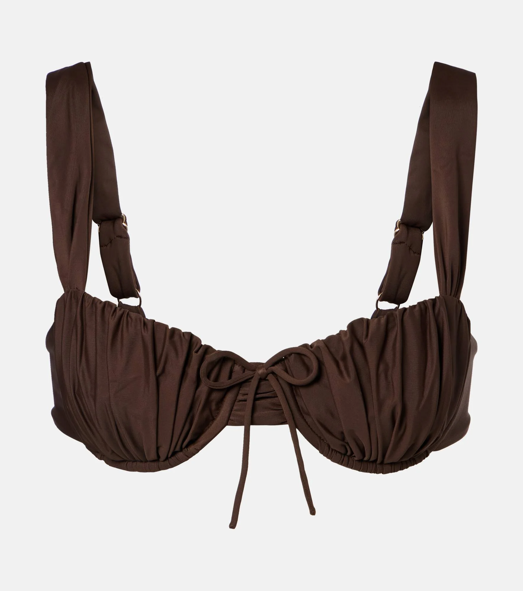 True to Faithfull's ethos, this design brings the brand's passion for travel and summertime into focus. The Dinard bikini top has a ruched design with adjustable shoulder straps, a bow detail, and supportive underwiring at the cups. Product Details - Material: 78% polyamide (recycled), 22% elastane - Care instructions: hand wash cold - Made in Indonesia - Designer color name: Hazelnut - Item color: brown - Hardware color: gold - Adjustable shoulder straps - Underwired cups - Item number: P01130440 Size & Fit - True to size - Underwired top - Unpadded Top - The model seen in the picture is 178cm-5'10", cup size B, and wearing a size XS