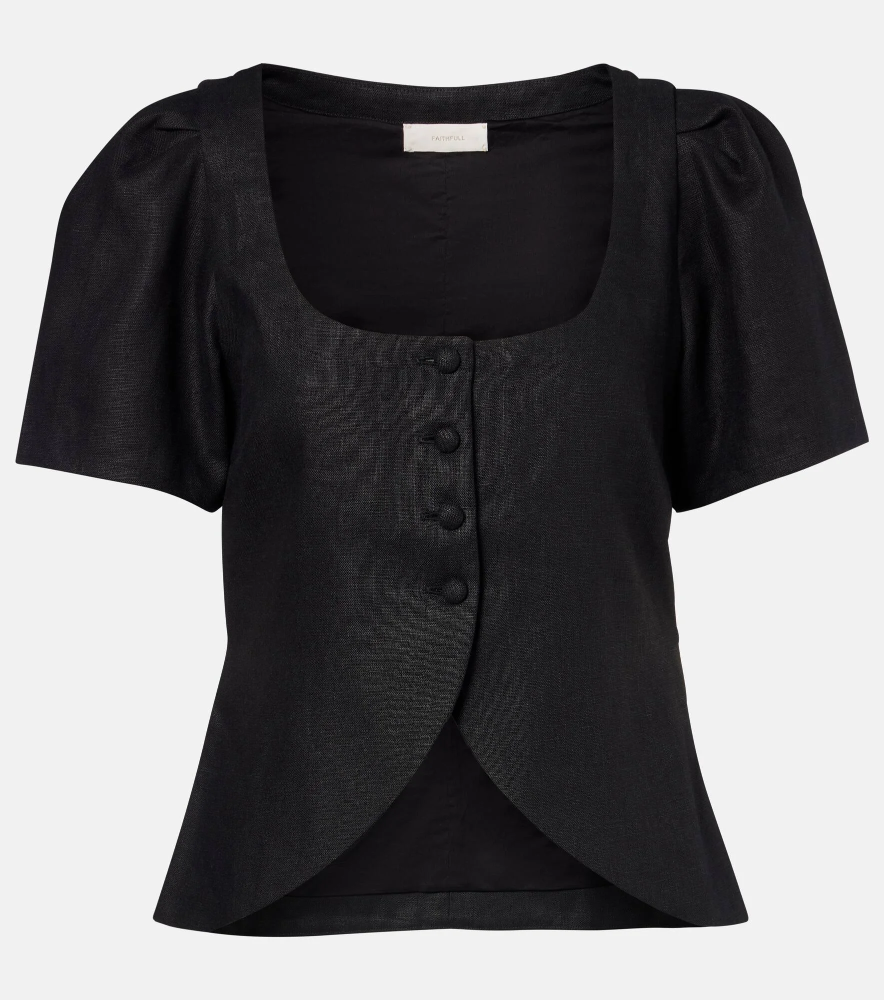 For Faithfull, summer never ends. The Emma top is made purely from breezy linen and features a scoop neckline and a vest-inspired silhouette with a button-down front and self-tie at the back to cinch the waist. Product Details - Material: 100% linen - Care instructions: dry clean - Made in Indonesia - Color: black - Designer color name: Black - Item color: black - Lining: 100% cotton - Closure: buttoned front - Self-tie back - Item number: P01130451 Size & Fit - True to size - Cinched waist - Adjustable at the waist - Non-stretchy fabric - Falls to the hip - The model seen in the picture is 178cm-5'10" and wearing a size XS
