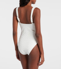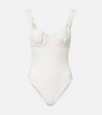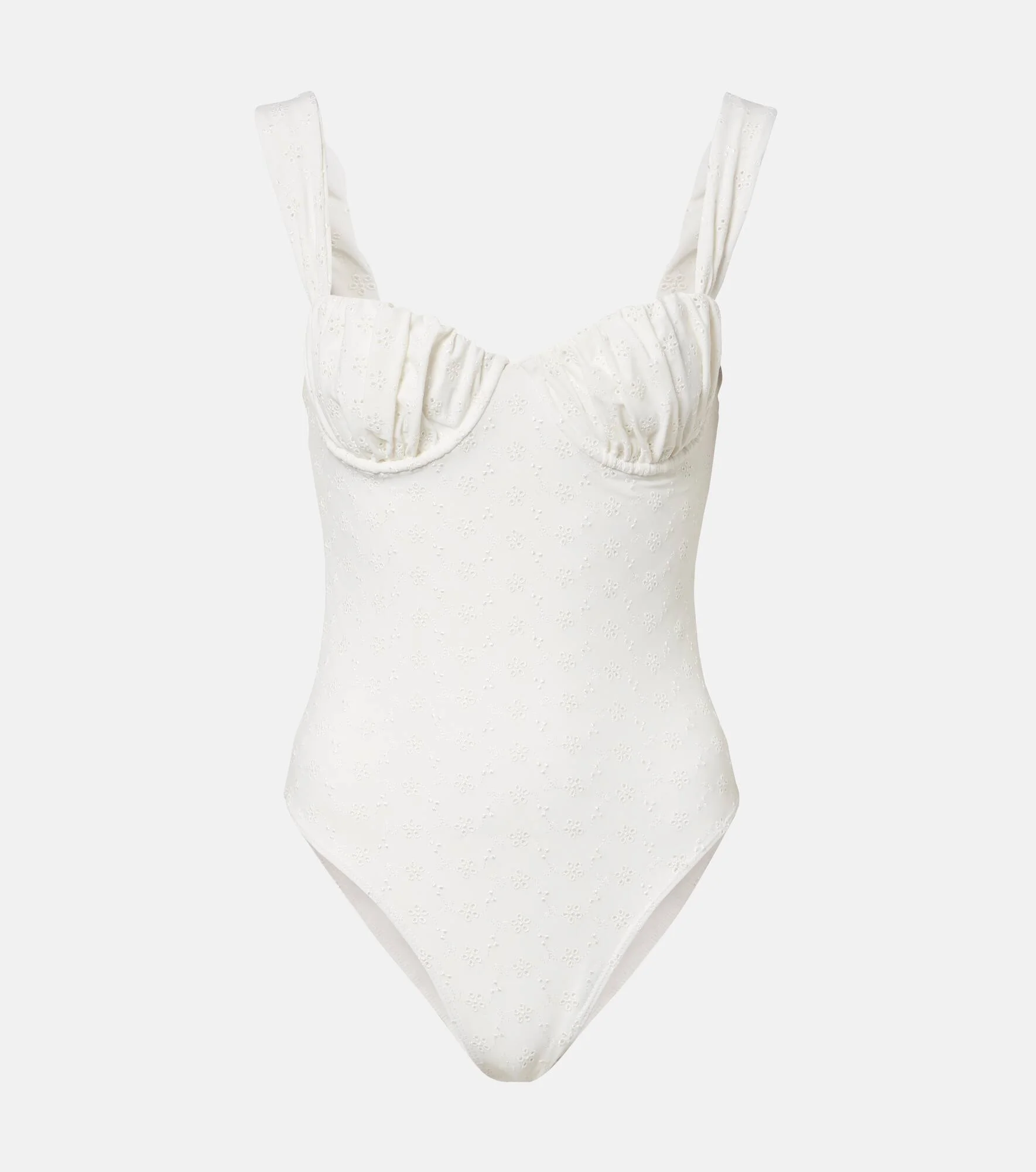 The Frida swimsuit from Faithfull is perfect for sophisticated beachside or poolside lounging. This one-piece features a balconette design with adjustable straps and underwired cups, providing comfortable coverage. Product Details - Material: 82% nylon, 18% elastane - Care instructions: hand wash - Made in Indonesia - Designer color name: Broderie Anglaise - Item color: white - Lining: 78% polyamide (recycled), 22% elastane - Adjustable shoulder straps - Underwired cups - Item number: P01093356 Size & Fit - Fits small to size - we recommend trying one size larger - Underwired top - Unpadded Top - Medium-cut leg - The model seen in the picture is 178cm-5'10", cup size B, and wearing a size S