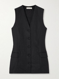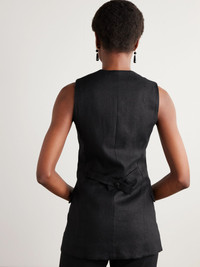 Faithfull combines tailoring and ease with this 'Eloise' vest. Cut from certified linen for a longer profile, it's traced with tonal buttons and has a back tab to create a more fitted look. Wear yours with tonal pants or jeans. Lower-Impact Materials. This product is made using at least 50% lower-impact materials or ingredients. Find out more about our NET SUSTAIN criteria here. Size & Fit - Fits true to size, take your normal size - Designed for a slim fit - Lightweight, non-stretchy fabric - Model is 180cm/ 5'11" and is wearing a size XSmall Model measurements: - Bust: 75cm/ 29.5" - Waist: 60.5cm/ 24" - Hip: 88.5cm/ 35" Details & Care - Black linen - Button fastenings through front - 100% linen; lining: 100% cotton - Hand wash