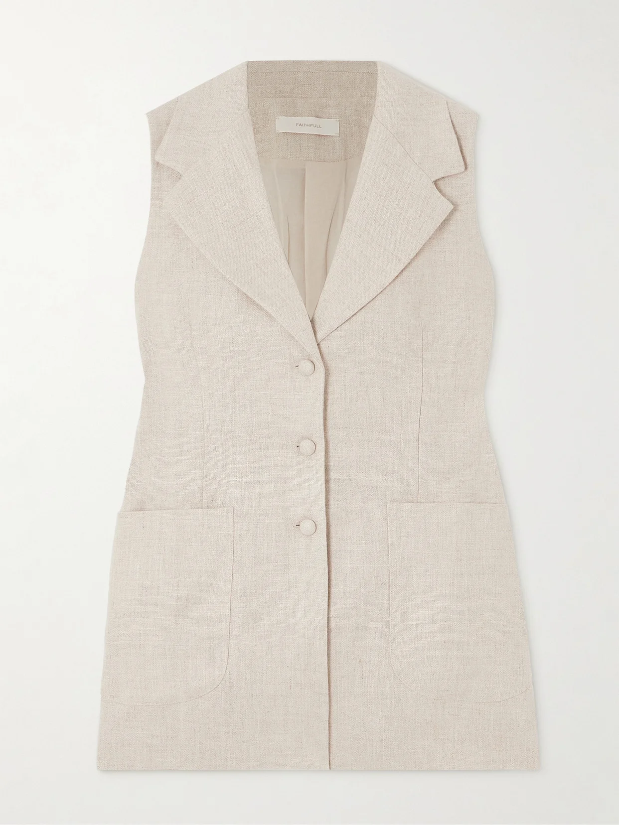 Faithfull's 'Josette' vest is a sophisticated choice for warm weather. Tailored from certified linen, it has darts through the front and an adjustable back tab to create a streamlined fit. It's framed by wide notch lapels and detailed with oversized patch pockets and covered buttons. Lower-Impact Materials. This product is made using at least 50% lower-impact materials or ingredients. Find out more about our NET SUSTAIN criteria here.