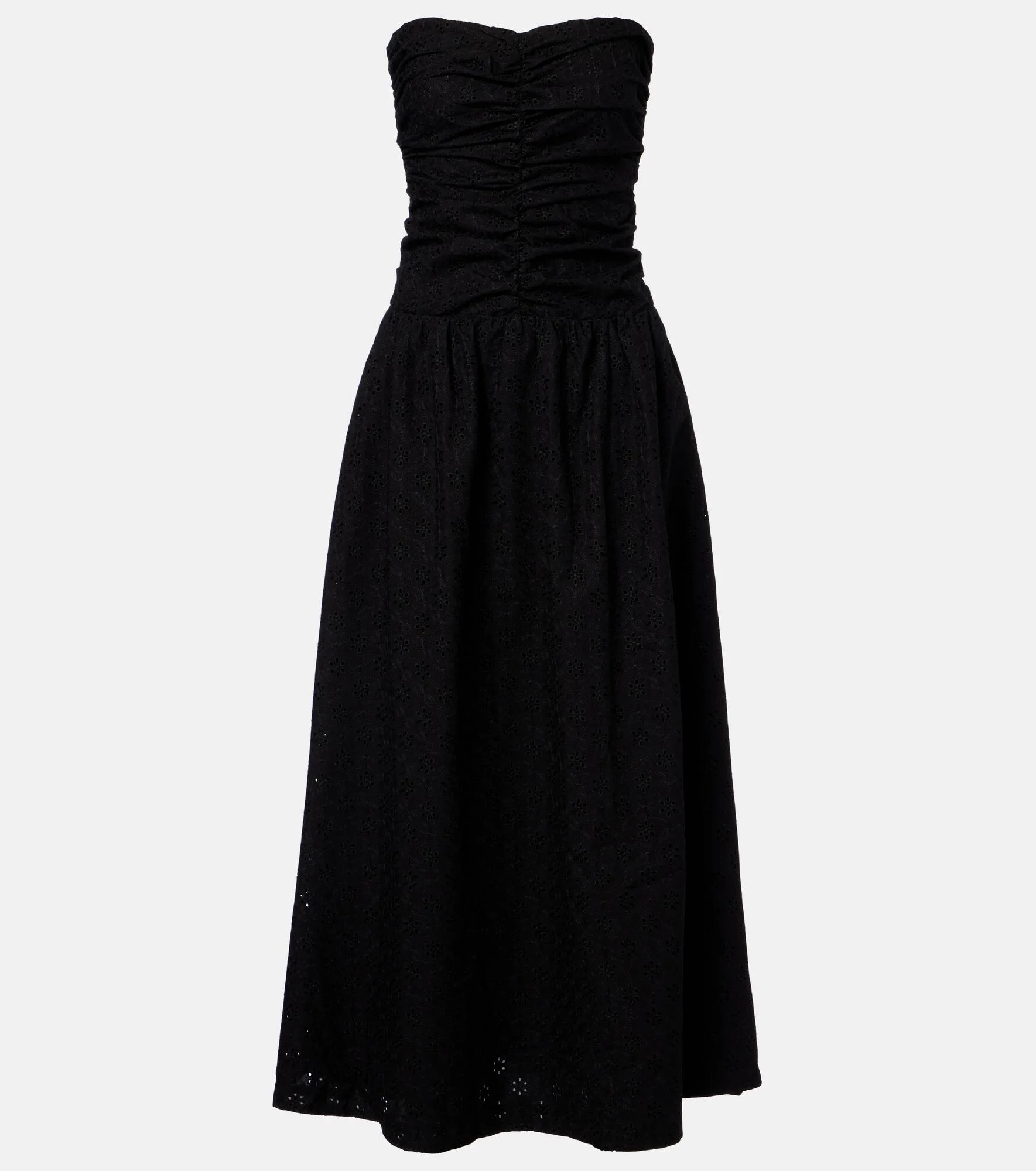 True to Faithfull's ethos, the Lia maxi dress brings the brand's passion for travel and summertime into focus. The design showcases delicate broderie anglaise and a ruched, strapless bodice. Product Details - Material: 65% polyester, 35% cotton - Care instructions: hand wash - Made in Indonesia - Color: black - Designer color name: Valentina Broderie Black - Item color: black - Lining: 100% cotton - Closure: concealed zipped back - Pockets: side slit pockets - Item number: P01130355 Size & Fit - True to size - Strapless - Elasticated top - Cinched waist - Non-stretchy fabric - The model seen in the picture is 178cm-5'10" and wearing a size XS