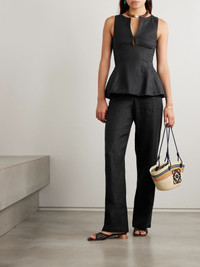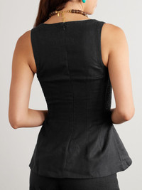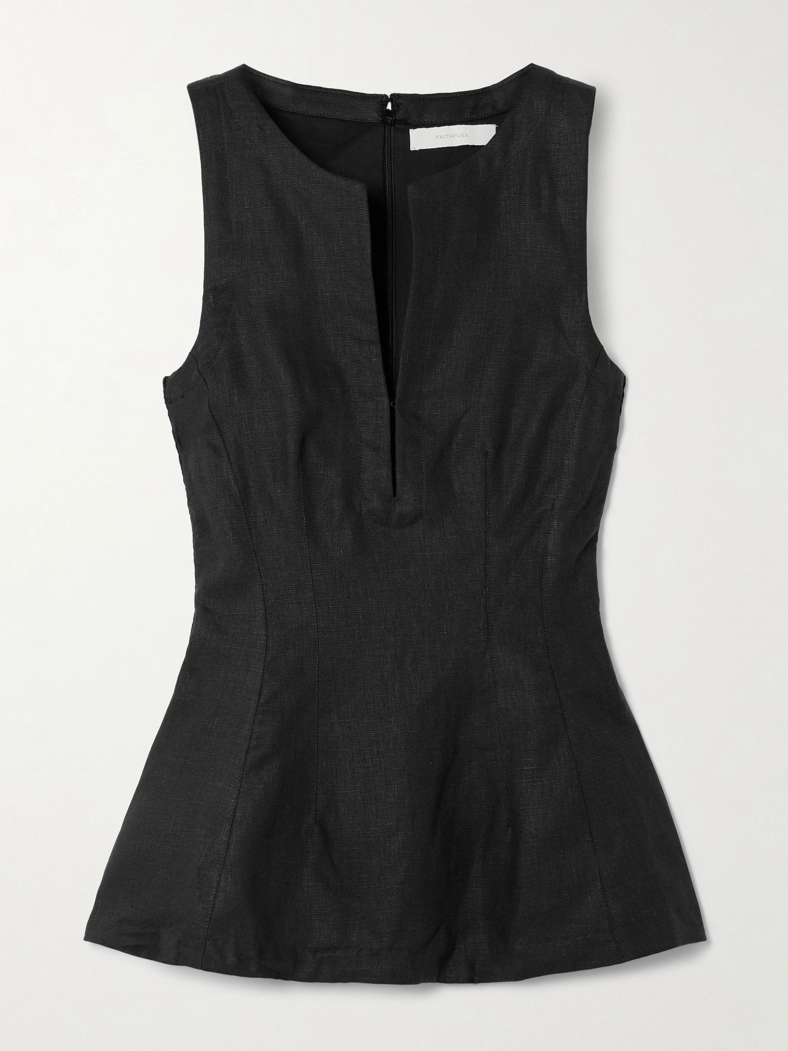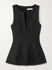 Faithfull's 'Melia' top is so chic and sophisticated. It's made from certified linen with a deep V-neckline, darted waist and subtle peplum hem. Wear yours with wide-leg pants. Lower-Impact Materials. This product is made using at least 50% lower-impact materials or ingredients. Find out more about our NET SUSTAIN criteria here. Size & Fit - Fits true to size, take your normal size - Cut to be fitted at the bust and waist, slightly loose at the hip - Mid-weight, non-stretchy fabric - Model is 177cm/ 5'10" and is wearing a size XSmall Model measurements: - Bust: 81cm/ 32" - Waist: 68cm/ 27" - Hip: 94cm/ 37" Details & Care - Black linen - Concealed hook and zip fastening at back - 100% linen; lining: 100% cotton - Fully lined - Hand wash