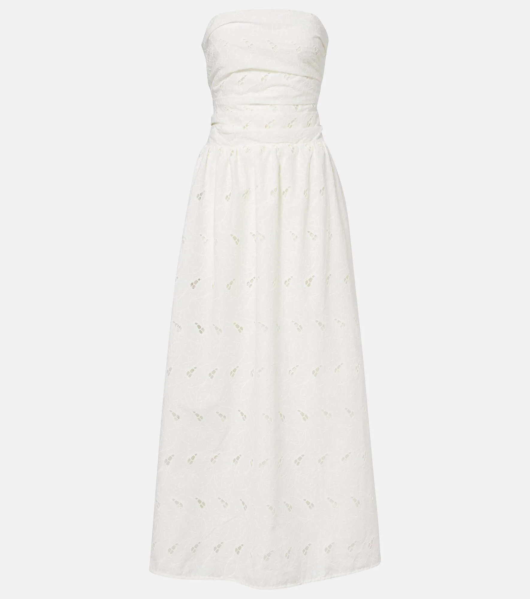 True to Faithfull's ethos, the Moa maxi dress brings the brand's passion for travel and summertime into focus. This design is finished with charming broderie anglaise and boasts a draped, strapless bodice and a flared skirt. Product Details - Material: 65% polyester, 35% cotton - Care instructions: hand wash - Made in Indonesia - Designer color name: Birgitta Broderie White - Item color: white - Lining: 100% cotton - Closure: zipped back - Item number: P01093354 Size & Fit - True to size - Strapless - Elasticated top - Cinched waist - Non-stretchy fabric - The model seen in the picture is 178cm-5'10" and wearing a size XS