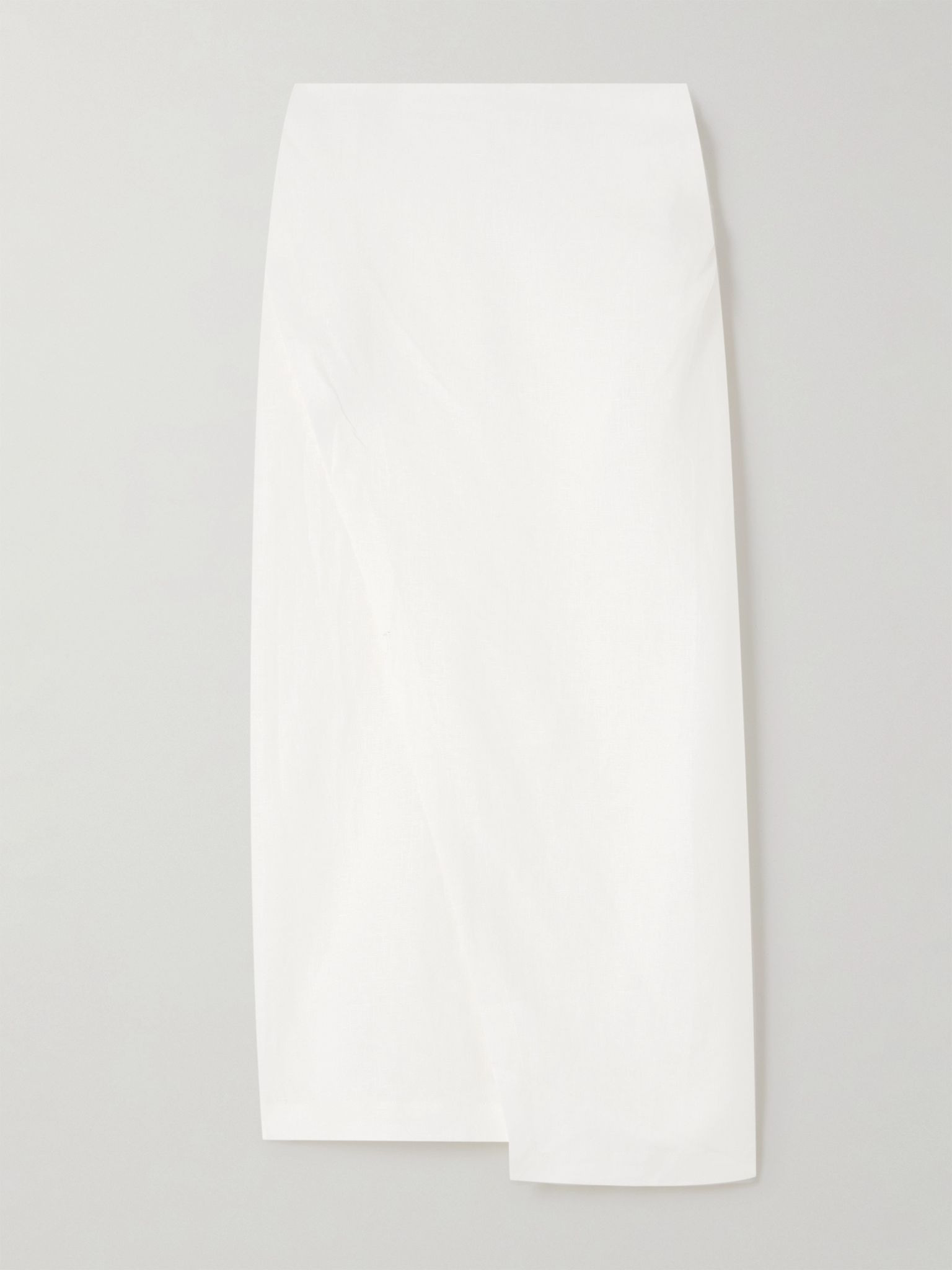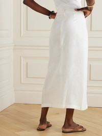 Faithfull's 'Suis' midi skirt has a wrap-effect shape that creates a leg-baring front split. It's made from lightweight linen and sits on your natural waist. Pair yours with the matching top. Size & Fit - Fits true to size, take your normal size - Midi-length, designed to be worn at the waist - Lightweight, non-stretchy fabric - Model is 177cm/ 5'10" and is wearing a size XSmall Model measurements: - Bust: 80cm/ 31.5" - Waist: 60cm/ 23.5" - Hip: 89cm/ 35" Details & Care - White linen - Concealed hook and zip fastening at back - 100% linen - Dry clean