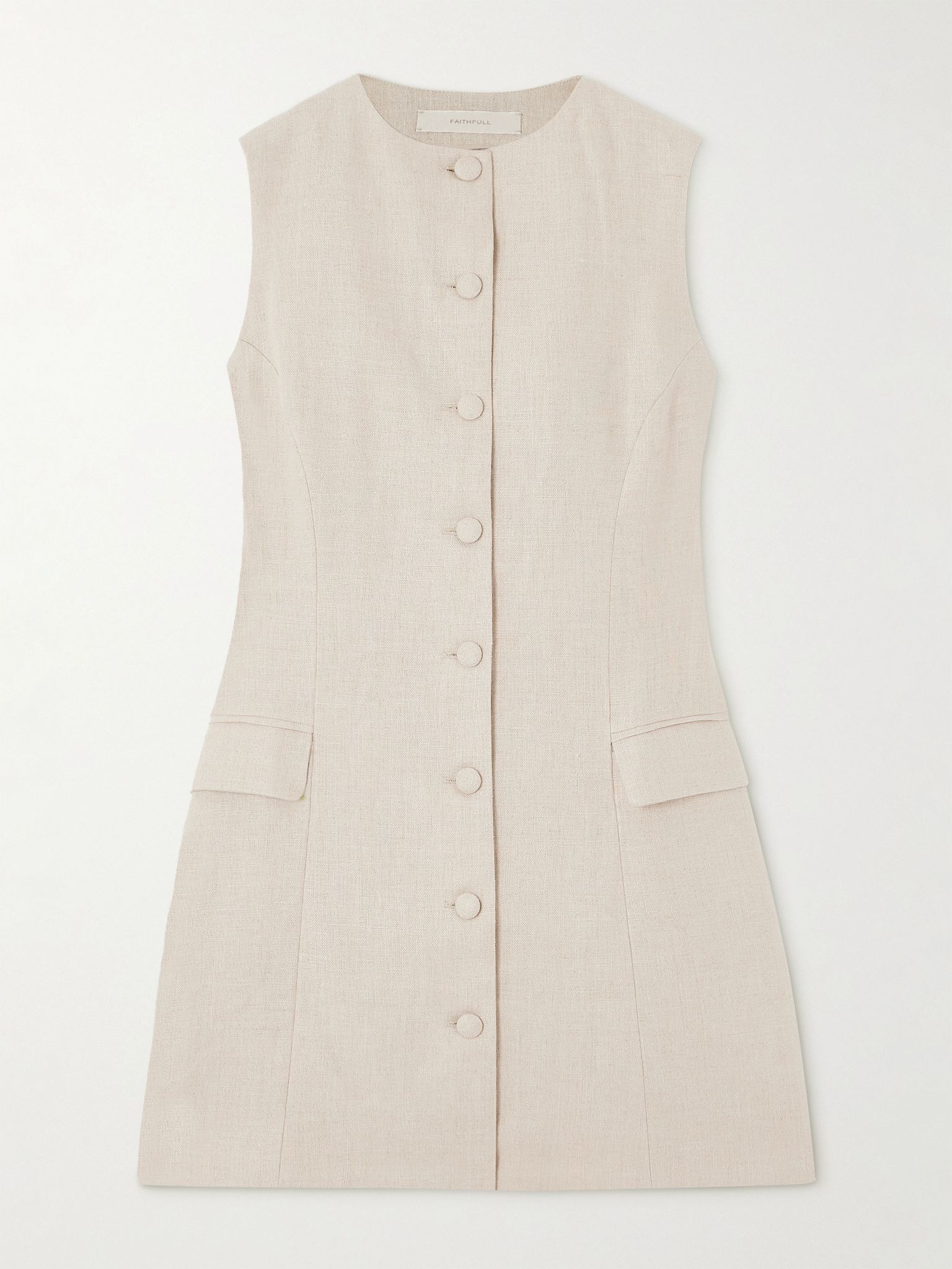Faithfull describes its collections as "a nostalgic nod to vintage wardrobes of summers past". Made from certified linen, this sleeveless 'Jane' dress is designed with flap pockets and chic covered buttons. Style yours with sandals and simple jewelry. Lower-Impact Materials. This product is made using at least 50% lower-impact materials or ingredients. Find out more about our NET SUSTAIN criteria here. Size & Fit - Fits true to size, take your normal size - Designed for a slim fit - Particularly short in length - Lightweight, non-stretchy fabric - Model is 180cm/ 5'11" and is wearing a size Small Model measurements: - Bust: 75cm/ 29.5" - Waist: 60.5cm/ 24" - Hip: 88.5cm/ 35" Details & Care - Beige linen - Button fastenings through front - 100% linen; lining: 100% rayon - Hand wash