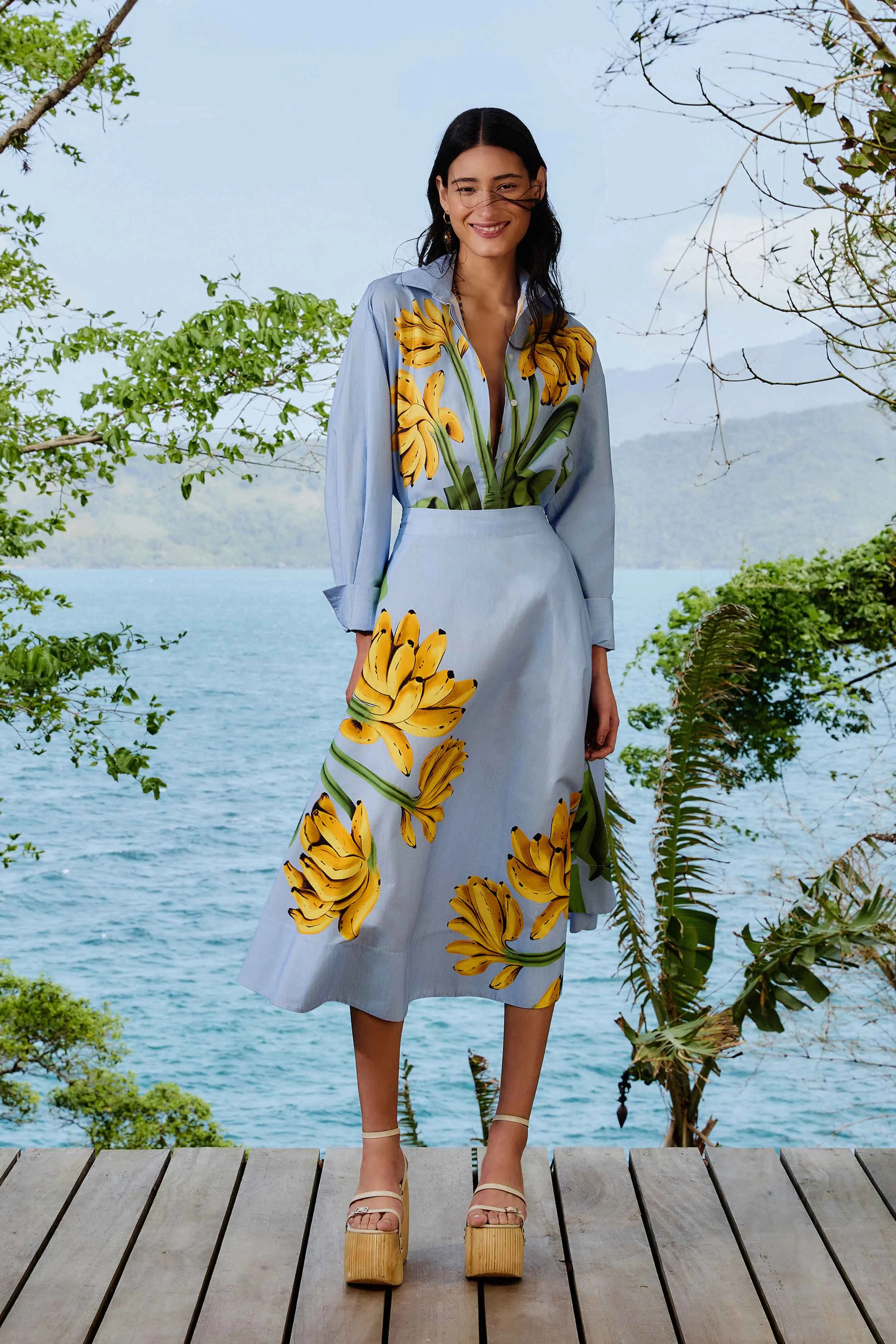 The Blue Banana Cocina Striped Midi Skirt by FARM Rio enchants with its playful charm. Adorned with vibrant banana clusters on a soothing blue backdrop, this flowing silhouette captures the joyful spirit of tropical adventures. Its midi length gracefully sways with every step, enveloping you in soft elegance. The whimsical pattern combined with a relaxed fit makes it a perfect choice for both sunlit strolls and breezy gatherings. - Closure: Invisible zipper at side seam - Pockets: Side seam pockets Ref.: sku_332585 Composition 55% LINEN 45% VISCOSE Care Instructions MACHINE WASH GENTLE CYCLE, DO NOT BLEACH, DO NOT TUMBLE DRY, LINE DRY IN SHADE, LOW IRON, DO NOT DRY CLEAN Product manufacturing: INDIA Product printing: INDIA