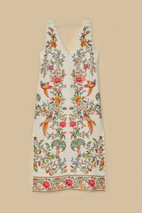 Immerse yourself in the enchanting allure of the Off-White Delicate Forest Euroflax™ Premium Linen Maxi Dress. Crafted from responsible materials, this dress showcases a vibrant botanical print brimming with colorful flora and charming avian motifs. The playful scalloped edges along the V neckline add a delightful touch, while the breezy silhouette promises effortless elegance. Perfect for moments when nature and style harmoniously intertwine. - Pockets: Side seam pockets - Sleeve type: Sleeveless LENZING™ ECOVERO™: the eco-responsible fibers generate up to 50% lower emissions and water impact compared to generic viscose. Ref.: sku_335784 Composition 100% LINEN Care Instructions HAND WASH SEPARATELY, DO NOT BLEACH, DO NOT TUMBLE DRY, LINE DRYING, IRON AT LOW HEAT, DO NOT DRY CLEAN Product manufacturing: CHINA Product printing: CHINA