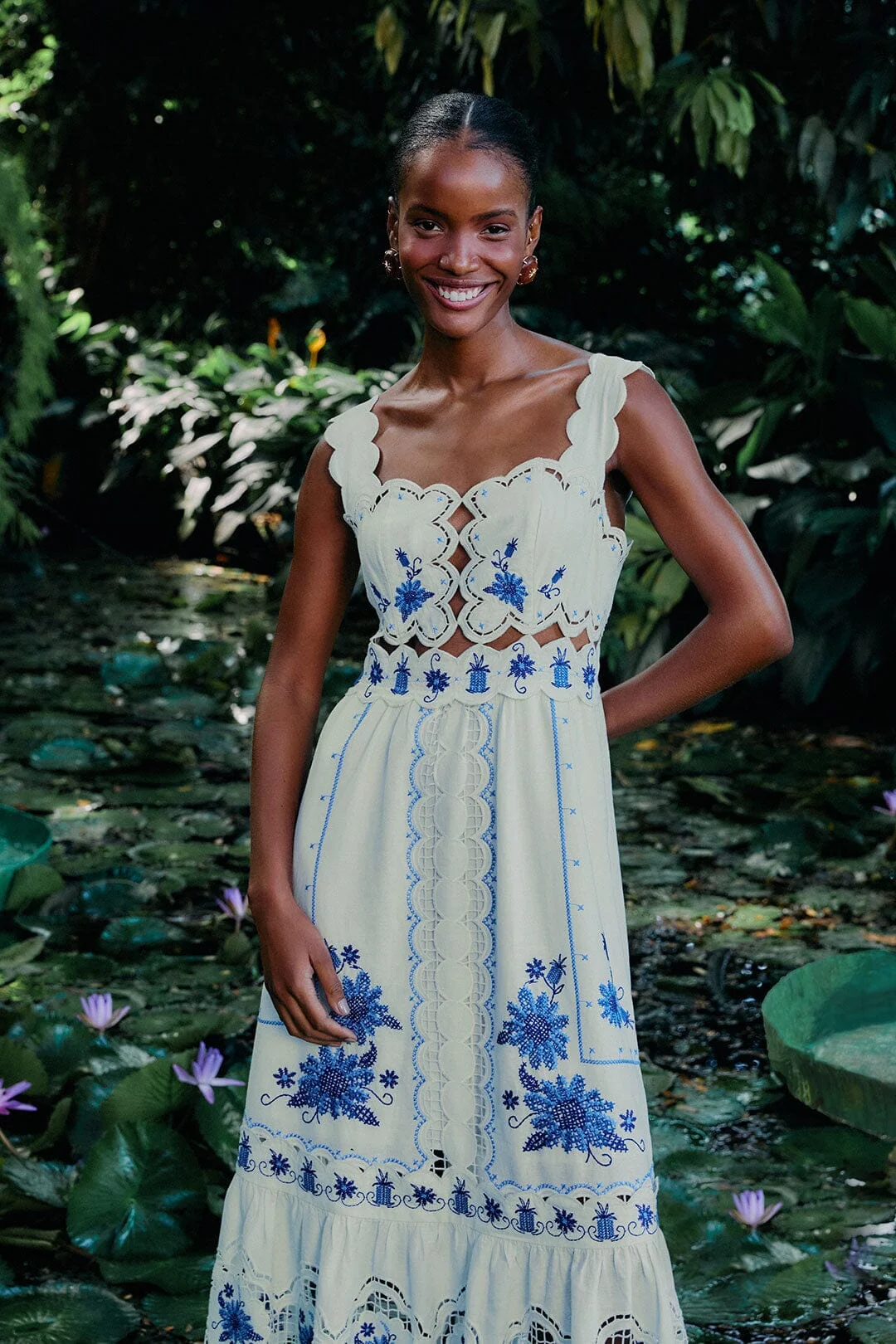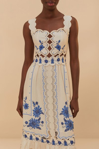 Step into a world of elegance with the Off-White Richelieu Sunflower LENZING™ ECOVERO™ Euroflax™ Midi Dress. This enchanting piece features intricate richelieu embroidery with vibrant blue floral patterns dancing gracefully against a soft off-white background. A playful V neckline and delicate scalloped straps add a touch of whimsy, while the dress flows into a midi silhouette. Crafted from responsible materials, this piece captures the essence of effortless charm. LENZING™ ECOVERO™: the eco-responsible fibers generate up to 50% lower emissions and water impact compared to generic viscose. Ref.: sku_343969 Composition 55% LINEN 45% VISCOSE Care Instructions HAND WASH SEPARATELY, DO NOT BLEACH, DO NOT TUMBLE DRY, DRY FLAT, IRON AT LOW HEAT, DRY CLEAN WITH ANY SOLVENT EXCEPT TRICHLOROETHYLENE Product manufacturing: CHINA Product printing: CHINA