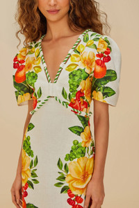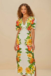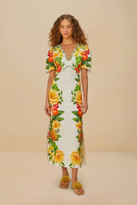 The Off-White Picnic Flowers Euroflax™ Premium Linen Maxi Dress embraces you with vibrant floral patterns that dance across its soft off-white canvas. Crafted from responsible materials, its V neckline meets playful puffed sleeves, exuding a delightful charm. The fitted silhouette flows into a relaxed maxi length, perfect for sunlit strolls. This dress is a celebration of color and carefree elegance, making every moment feel like a blooming escape. - Closure: Invisible zipper at side seam - Sleeve type: Short sleeve LENZING™ ECOVERO™: the eco-responsible fibers generate up to 50% lower emissions and water impact compared to generic viscose. Ref.: sku_335815 Composition 100% LINEN Care Instructions HAND WASH SEPARATELY, DO NOT BLEACH, DO NOT TUMBLE DRY, LINE DRYING, IRON AT LOW HEAT, DO NOT DRY CLEAN Product manufacturing: CHINA Product printing: CHINA