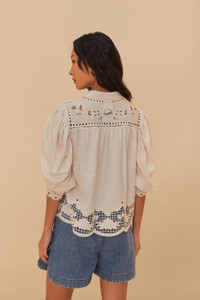 Embrace timeless elegance with our Off-White Romantic Richelieu LENZING™ ECOVERO™ Euroflax™ Blouse. Delicate eyelet details dance across its high neckline and puffed sleeves, creating a subtle playfulness. Crafted from responsible materials, this blouse features intricate richelieu embroidery and scalloped edges, adding unique charm. Perfect for a leisurely stroll or a casual day out, it blends effortless style with thoughtful design, inviting a touch of romance to your wardrobe. LENZING™ ECOVERO™: the eco-responsible fibers generate up to 50% lower emissions and water impact compared to generic viscose. Ref.: sku_337606 Composition 55% LINEN 45% VISCOSE Care Instructions HAND WASH SEPARATELY, DO NOT BLEACH, DO NOT TUMBLE DRY, DRY FLAT, IRON AT LOW HEAT, DRY CLEAN WITH ANY SOLVENT EXCEPT TRICHLOROETHYLENE Product manufacturing: CHINA Product printing: CHINA