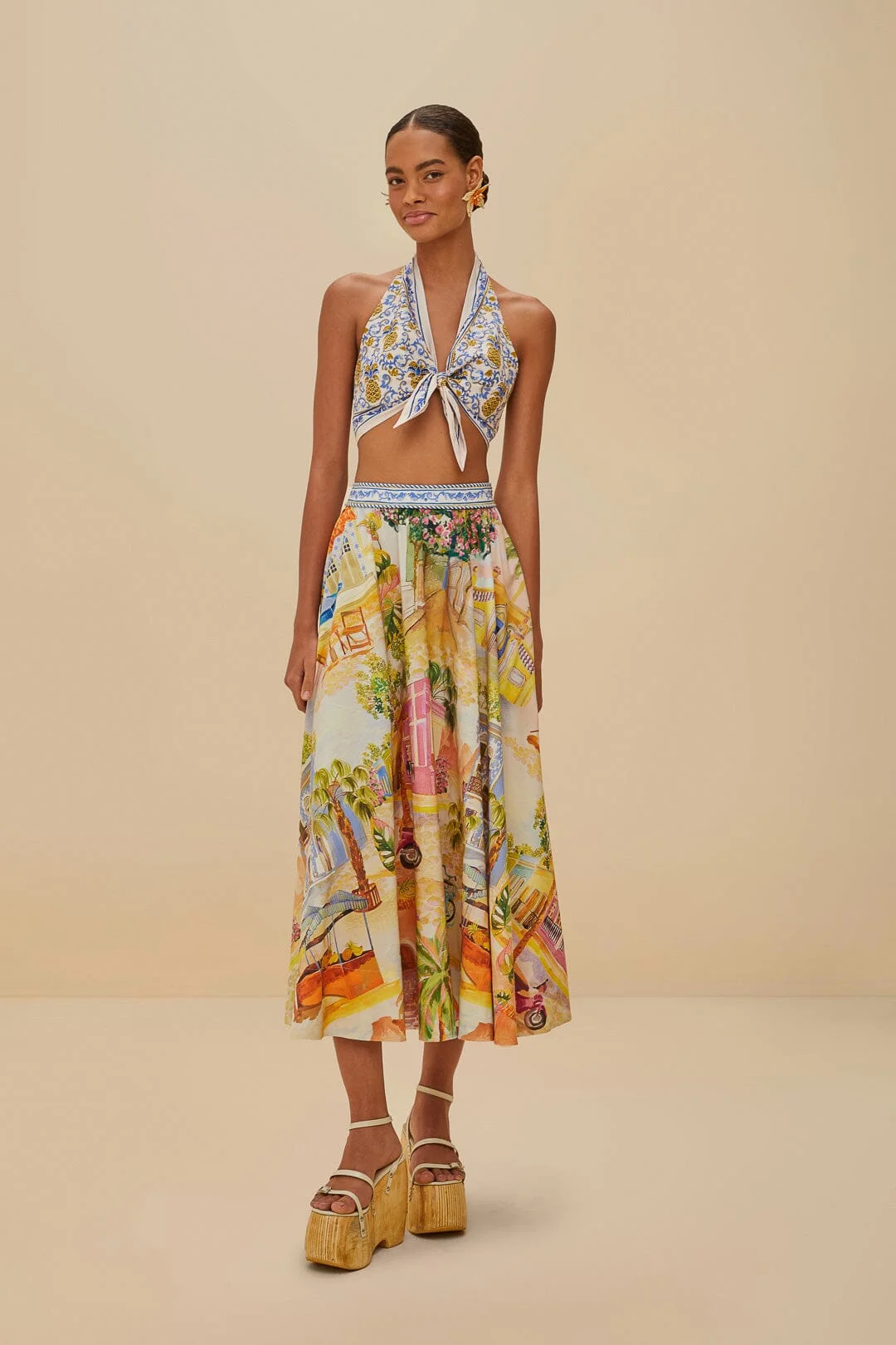 Step into a vibrant world with the Multicolor Aracati Organic Cotton Midi Skirt. Crafted from responsible materials, its flowing silhouette features a delightful tapestry of tropical scenes in lush greens, bright yellows, and soft pinks. The artisanal waistband adds a delicate touch, complementing the playful artistry that embodies a free-spirited charm. Embrace the essence of joyful wanderlust with every twirl in this enchanting piece. - Closure: Invisible zipper at side seam - Pockets: Side seam pockets GOTS-certified organic cotton has a lower environmental impact than conventional cotton, as it reduces water usage, greenhouse gas emissions, and the amount of chemicals used. Ref.: sku_336649 Composition 100% COTTON Care Instructions MACHINE WASH GENTLE CYCLE, DO NOT BLEACH, DO NOT TUMBLE DRY, LINE DRYING, IRON AT LOW HEAT, DO NOT DRY CLEAN Product manufacturing: CHINA Product printing: CHINA