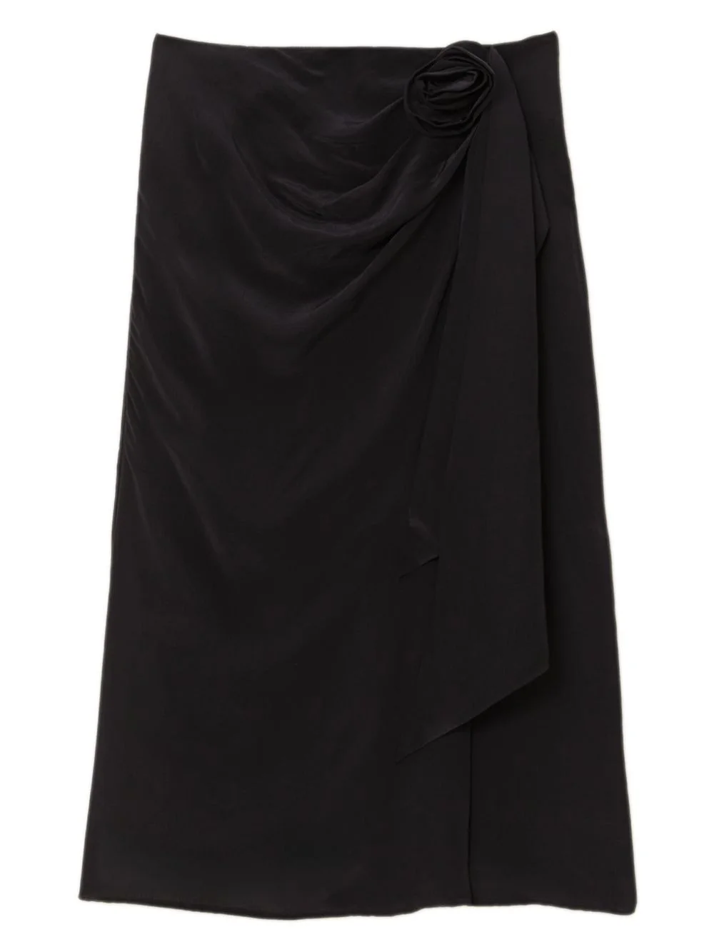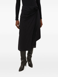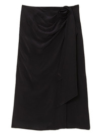 rose-embellished wrap midi skirt Highlights - Black - Rose embellishment - Wrap design - Asymmetrical hem - Side slit - Concealed zip fastening Imported Composition Viscose 100% Washing instructions Read Manufacturer Guidelines