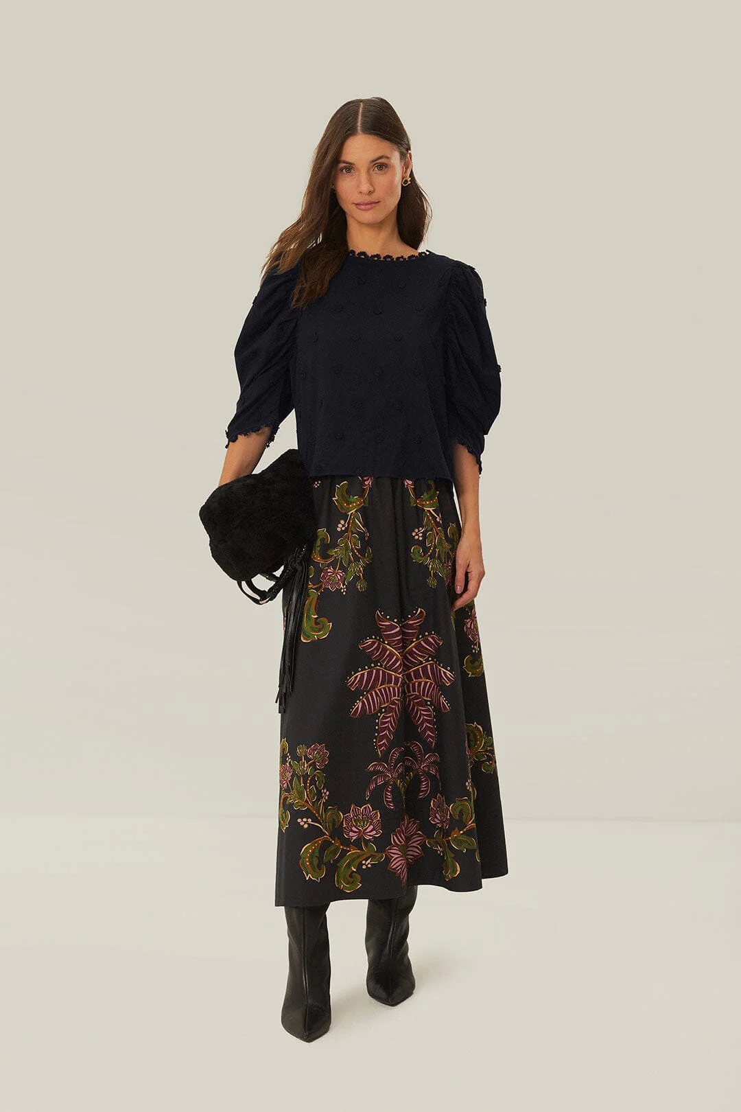 Embrace playful elegance with the Black 3D Flowers Blouse from FARM Rio. This blouse features intricate 3D floral embroidery, adding texture and charm to its rich black fabric. The round neckline and voluminous sleeves create a soft, flowing silhouette, perfect for any occasion. Delicate floral trims at the neckline and cuffs further enhance its unique appeal, inviting a lively spirit into your wardrobe. Ref.: sku_338615 Composition 100% COTTON Care Instructions MACHINE WASH, GENTLE CYCLE, DO NOT BLEACH, DO NOT TUMBLE DRY, LINE DRY, IRON AT MEDIUM HEAT, DO NOT DRY CLEAN Product manufacturing: INDIA Product printing: INDIA