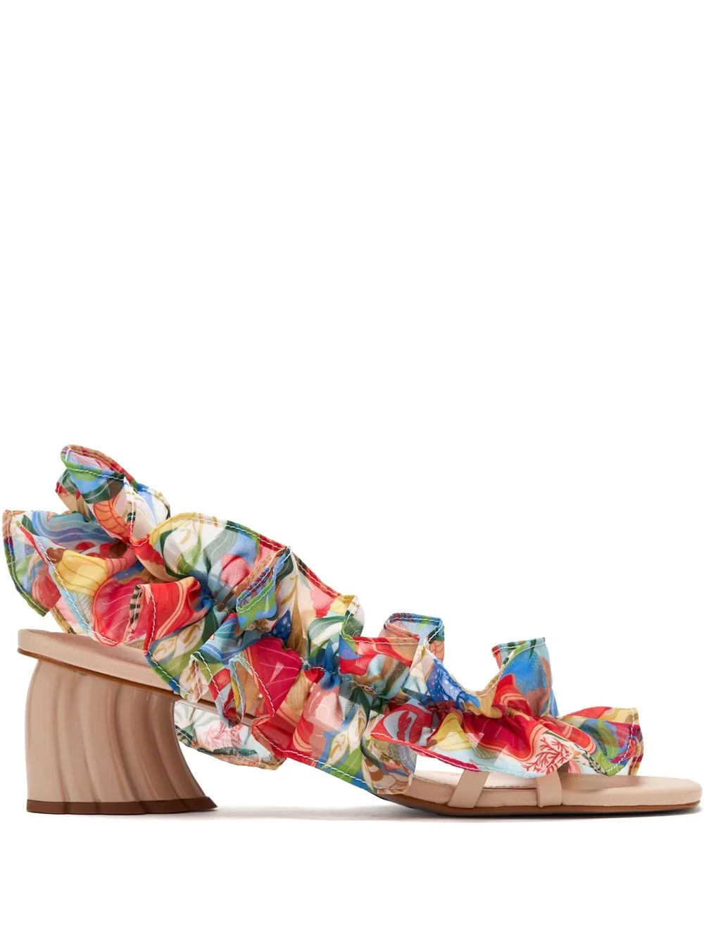 65mm Ocean View Monstera heeled sandals Highlights - Beige - Floral print - Ruffled straps - Sculpted block-heel - Ankle strap - Open toe Imported Composition Outer: Fabric 100% Lining: EcoVero Viscose (LENZING) 100% Sole: EcoVero Viscose (LENZING) 100% SIZE & FIT Measurement HEEL 2.55 in(6.5 cm)