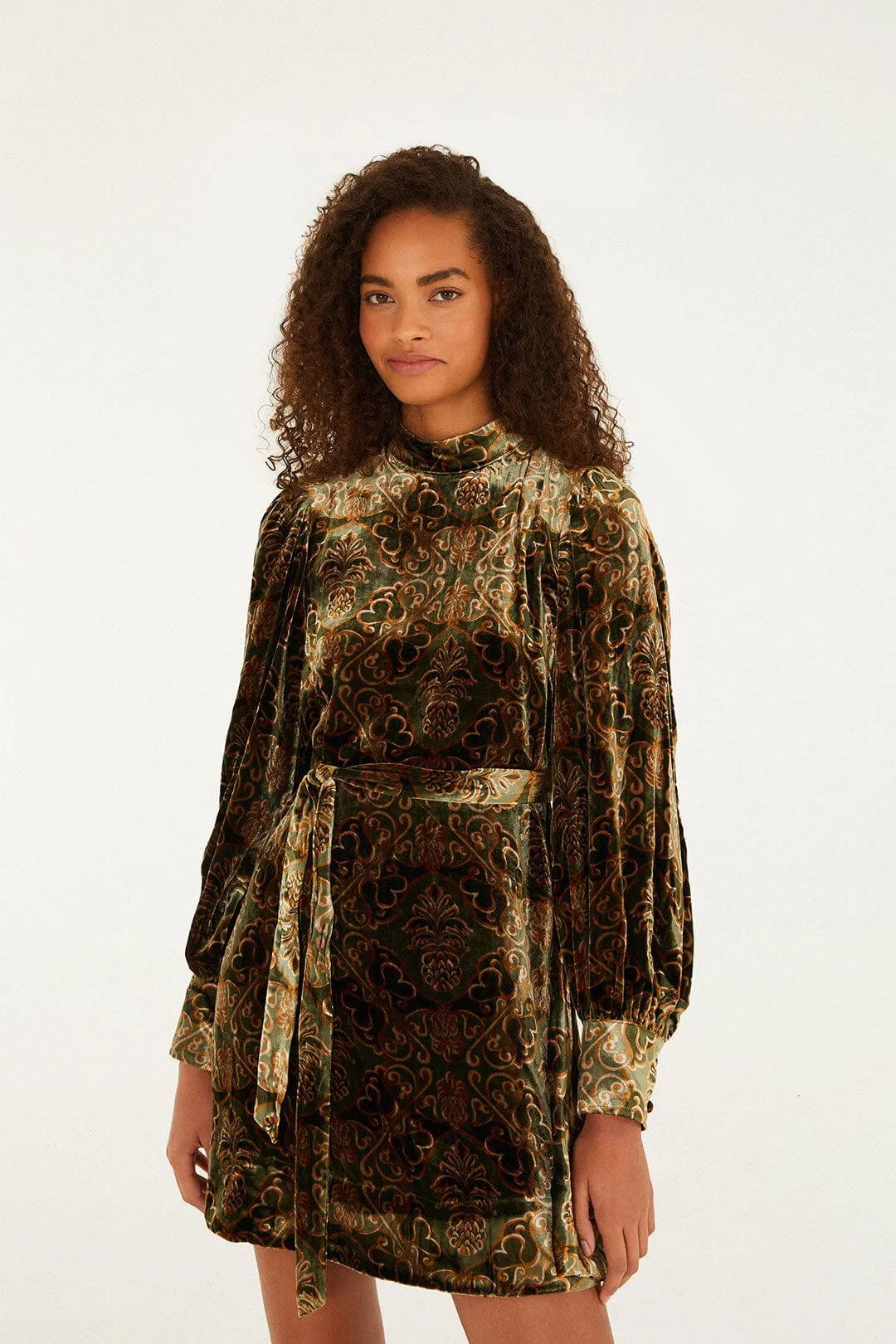 Fusing Barbour's signature countryside spirit and classic outerwear, footwear and accessories with FARM Rio's Brazilian spirit, the Barbour x FARM Rio collaboration offer timeless British heritage infused with Brazilian tropical vibrance. Making a bold statement from sleeve to skirt, the Barbour x FARM Rio Ana Clara Mini Dress is perfect for the upcoming party season. This luxurious velvet-touch mini dress showcases the exclusive Barbour x FARM Rio Pineapple print all over with elegant blouson sleeves, self-tie belted waist and keyhole to the back for added femininity. Simply style this statement style with tights and your go-to boots for a eye-catching look. Ref.: sku_340109