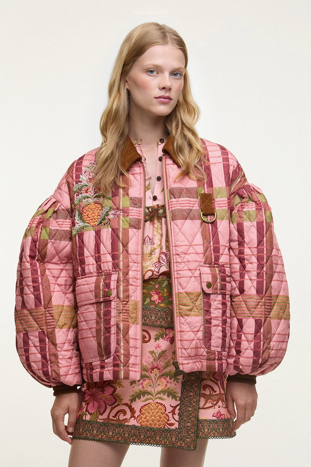 Fusing Barbour's signature countryside spirit and classic outerwear, footwear and accessories with FARM Rio's Brazilian spirit, the Barbour FARM Rio collaboration offer timeless British heritage infused with Brazilian tropical vibrance. Recognised for their vibrant Brazillian spirit and charm, FARM Rio brings its statement designs to Barbour. The Barbour FARM Rio Ana-Clara Quilted Jacket boasts signature Barbour details such as a D-ring to the chest, cord collar and trims and diamond quilting, all of which are perfectly balanced with the Barbour FARM Rio exclusive Pink Tartan print and Pineapple embroidery to the chest. Complete with exaggerated gathered sleeves and a dual branded patch the back, this quilted jacket is truly a showcase of expert craftsmanship. Ref.: 345290