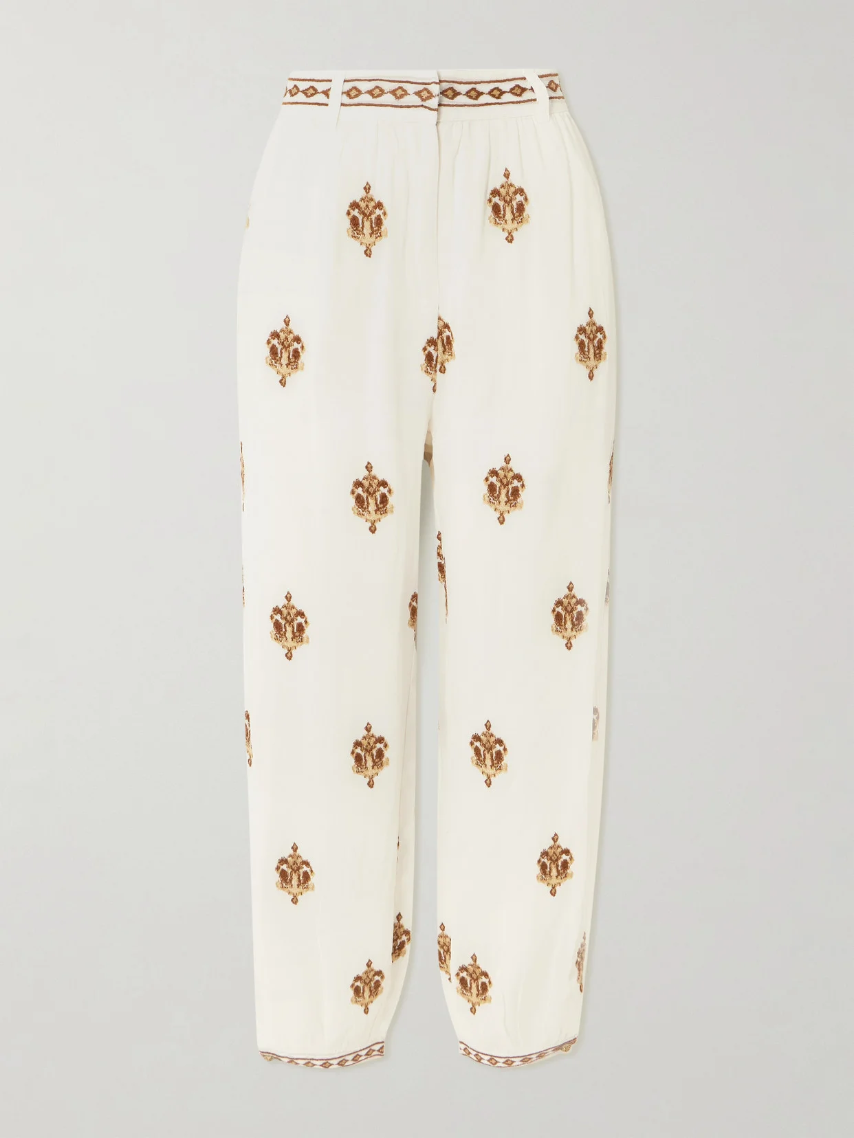 Farm Rio's pants are embroidered with a tapestry-inspired motif - wear yours with the brand's shirt in the same pattern. They're made from lightweight georgette and have tapered legs with buttoned cuffs.