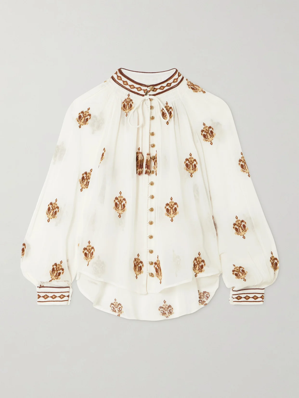 Farm Rio's 'Anchor Tapestry' blouse features embroidery that cascades from the shoulders to the hem. It's made from flowy georgette and has a gently plunging neckline and billowing sleeves.