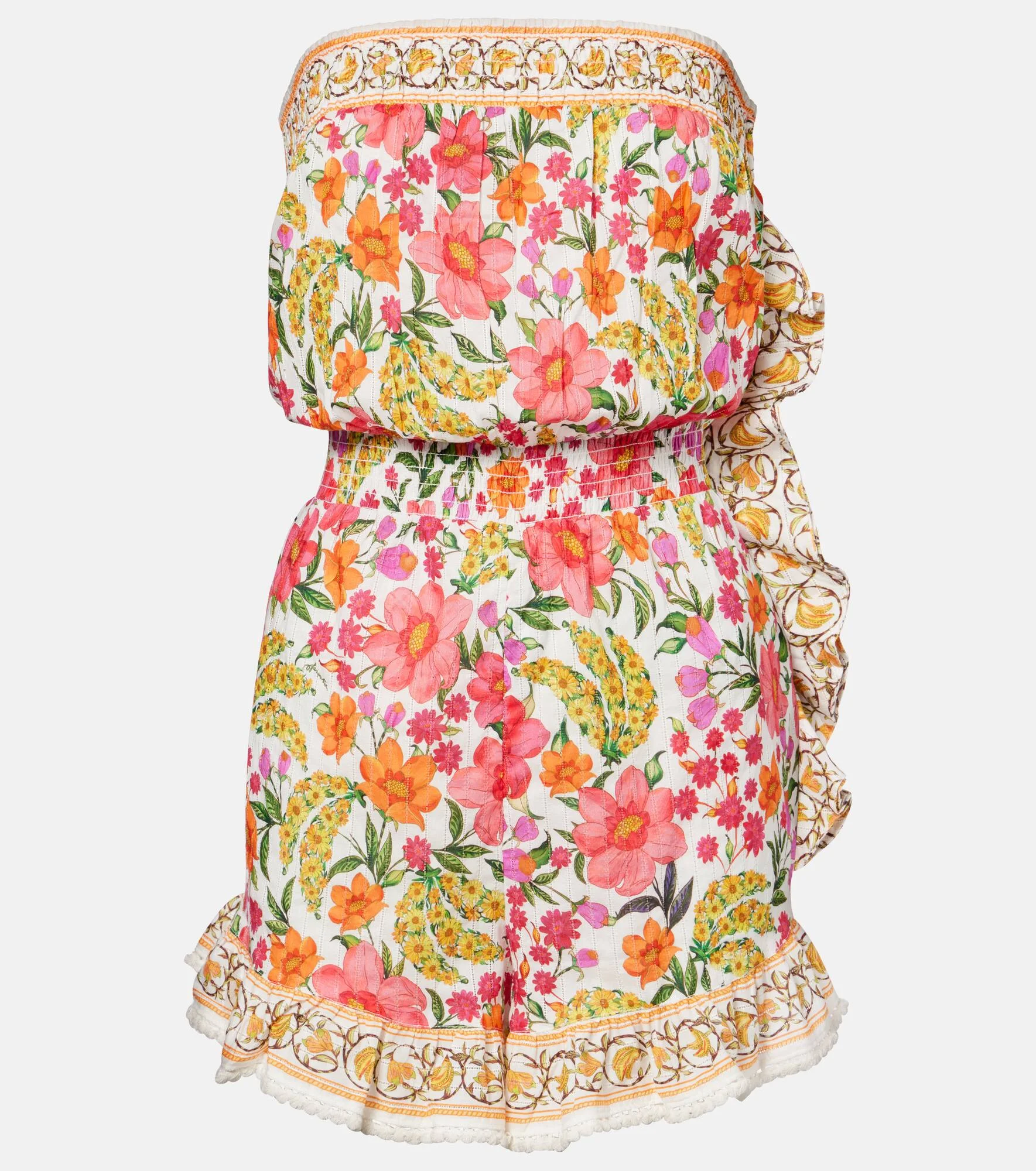 Farm Rio's signature vibrant prints celebrate the brand's Brazilian heritage and invite joyful self-expression. Decorated with all-over florals and bananas, this cotton minidress has a strapless silhouette with delicate ruffle detailing. Product Details - Material: 100% cotton - Care instructions: machine wash at 30 degrees - Made in India - Designer color name: Banana Flowers Off-White - Item color: multicolor - Elasticated waistband - Pockets: side slit pockets - Item number: P01120724 Size & Fit - True to size - Strapless - Loose fit, elasticated waist - Non-stretchy fabric - Wide-leg - The model seen in the picture is 178cm-5'10" and wearing a size XS
