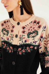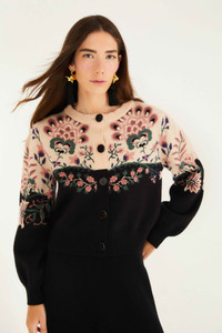 Embrace cozy elegance with the Belle Garden Mixed Knit Cardigan, where soft hues of beige and black blend seamlessly into a garden-inspired tapestry. This piece highlights intricate floral patterns that dance across the shoulders and sleeves, while a round neckline frames the face with gentle warmth. The relaxed silhouette and carefully crafted knit bring a playful yet intimate touch, inviting comfort and graceful style into everyday moments. - Closure: Center Front Buttons - Button type: Plastic Button - Sleeve type: Long Sleeve Ref.: 340221 Composition 30% POLYESTER 24% VISCOSE 24% POLYAMIDE 22% ACRYLIC Care Instructions HAND WASH SEPARATELY, DO NOT BLEACH, DO NOT TUMBLE DRY, DRY FLAT, IRON AT LOW HEAT, DRY CLEAN WITH ANY SOLVENT EXCEPT TRICHLOROETHYLENE Fabric origin: China Product manufacturing: China Product printing: China