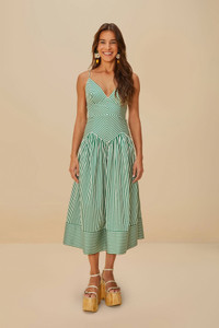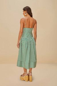 The Bicolor Stripes Organic Cotton Midi Dress exudes effortless charm with its playful V neckline and flowing silhouette. Crafted from responsible materials, it features eye-catching green and white stripes that dance across the fabric, creating a mesmerizing visual appeal. The fitted bodice, adorned with geometric patterns, elegantly transitions into a voluminous skirt, making it a delightful addition to any wardrobe. Perfect for making a vibrant statement. - Closure: Invisible zipper at center back - Sleeve type: Sleeveless GOTS-certified organic cotton has a lower environmental impact than conventional cotton, as it reduces water usage, greenhouse gas emissions, and the amount of chemicals used. Ref.: sku_335824 Composition 100% COTTON Care Instructions MACHINE WASH GENTLE CYCLE, DO NOT BLEACH, DO NOT TUMBLE DRY, LINE DRYING, IRON AT LOW HEAT, DO NOT DRY CLEAN Product manufacturing: CHINA Product printing: CHINA
