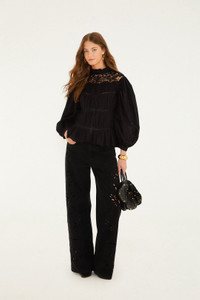 Step into effortless charm with FARM Rio’s Black Cut-Out Richelieu Denim Pants. Crafted in rich black denim, these pants feature intricate Richelieu cut-out details along the sides, blending boldness with delicate artistry. The relaxed yet structured silhouette flows comfortably, balancing modern edge with a playful twist. Perfect for those who love to express individuality, this piece brings warmth and a subtle statement to every look with its unique, handcrafted allure. Ref.: 344820