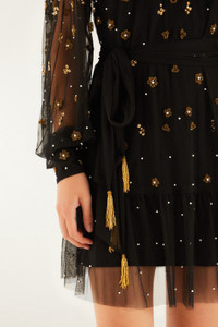 Black Embroidered Tulle Belted Long Sleeve Mini Dress