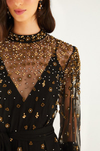 This Black Embroidered Tulle Belted Long Sleeve Mini Dress by FARM Rio envelops you in enchanting elegance. The sheer tulle fabric blooms with intricate gold floral embroidery and delicate white bead accents, crafting a whimsical texture. A softly gathered ruffle hem and billowy sleeves add romantic movement, while the belted waist highlights your silhouette with playful charm. This dress is a perfect dance of sophistication and joyful detail. Ref.: 346132